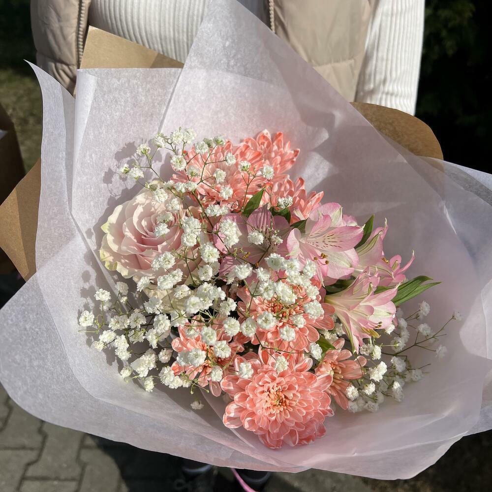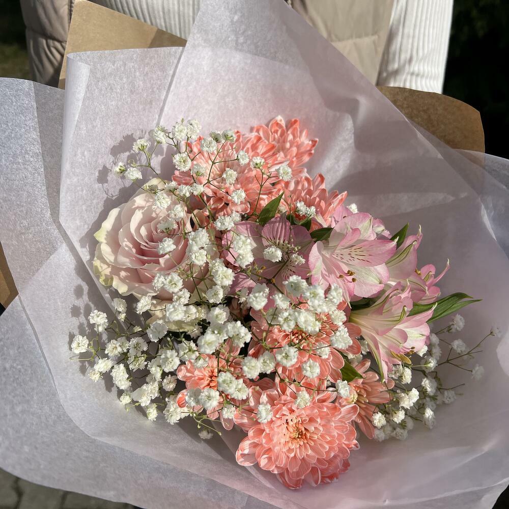 Alstroemeria - 1 ud. rosa - 1 ud. crisantemo - 2 ud. paniculata (gypsophila) - 1 ud.