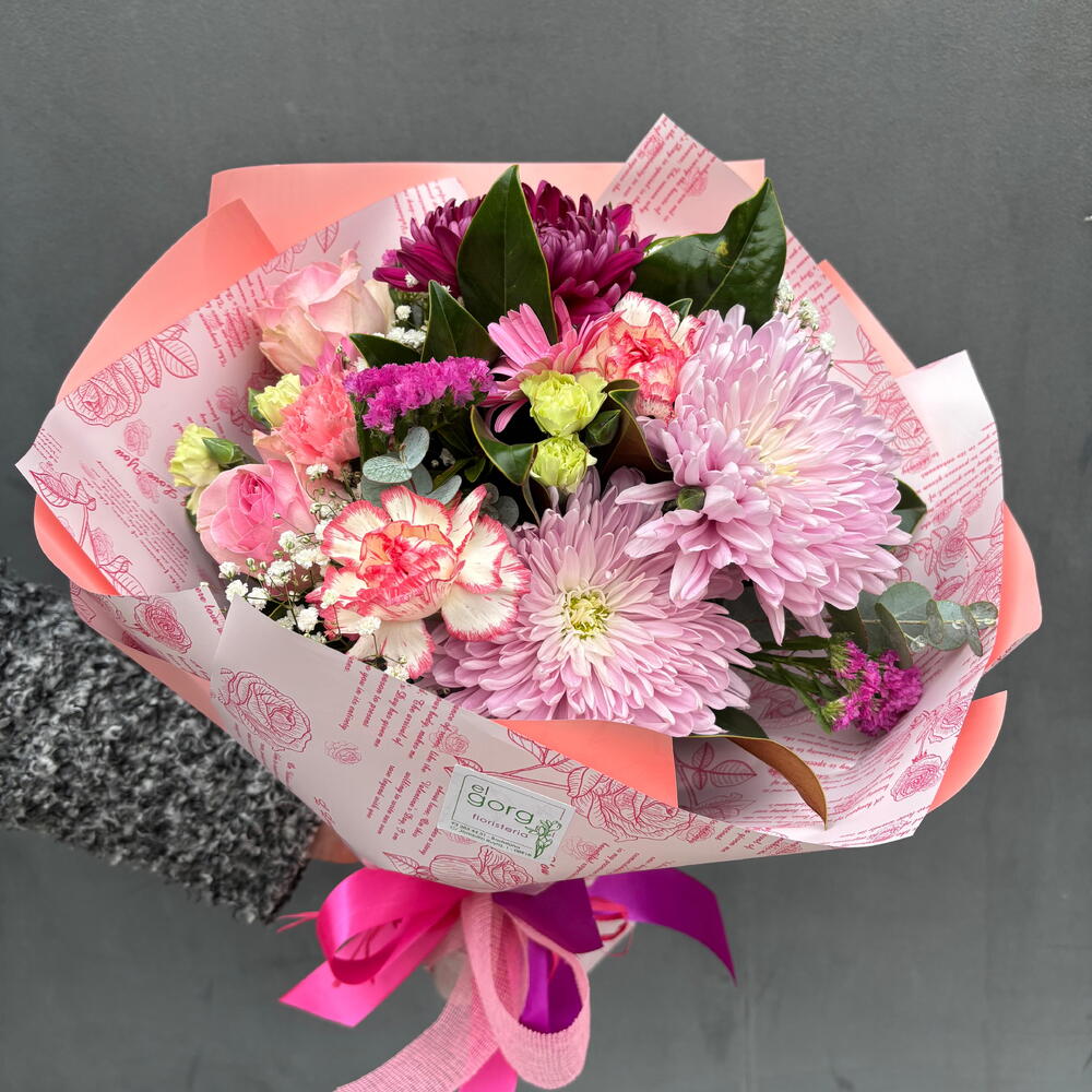 Statice - 3 ud. Gypsophila - 3 ud. gerbera mini - 3 ud. rosas - 3 ud. claveles - 3 ud. verdes variados - 5 ud. clavelina - 3 ud. uniflora - 3 ud. lazo del florista - 1 ud. envoltorio decorativo en picos - 1 ud.