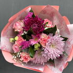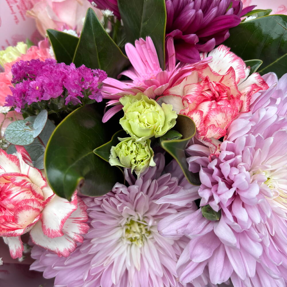 Celebrate the magic of natures beautiful blossoms with this unique Florists Special arrangement. This floral delight showcases an artistic blend of 3 pieces each of delicate Statice, whimsical Gypsophila, vibrant mini Gerberas, stunning Rosas, gentle Claveles, and striking Uniflora, perfectly balanced with 5 pieces of assorted greenery. An elegant touch of 3 Clavelina adds charm to this floral masterpiece. The bouquet is adorned with a florists ribbon, giving it a special touch. All these blooms come beautifully wrapped in a decorative wrap, making it perfect for gifting or adding a splash of color to your space.