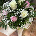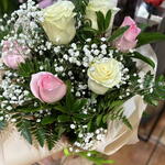 rosas blancas - 3 ud. gisofila - 3 ud. rosas de color rosa - 3 ud. helecho y verdes - 4 ud.