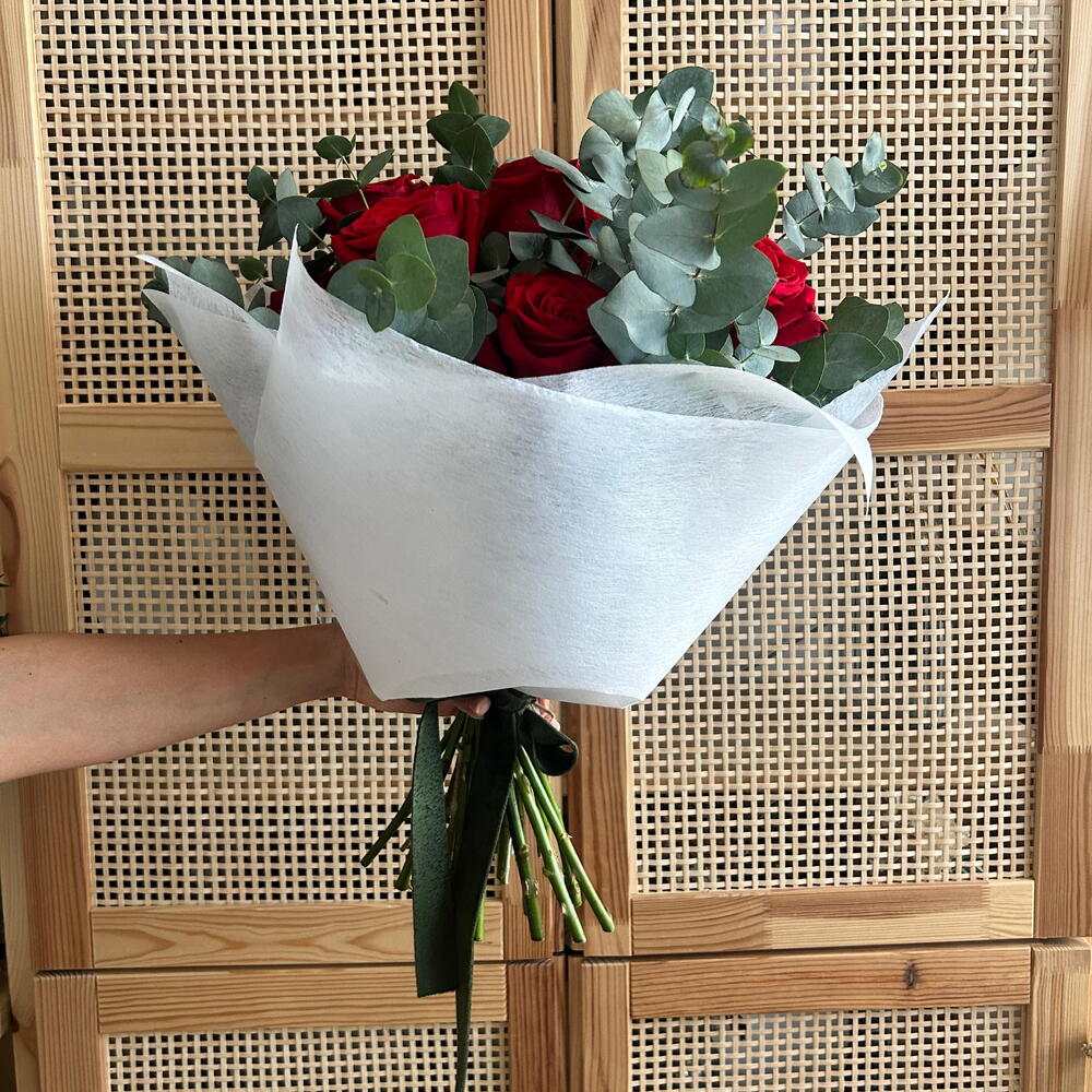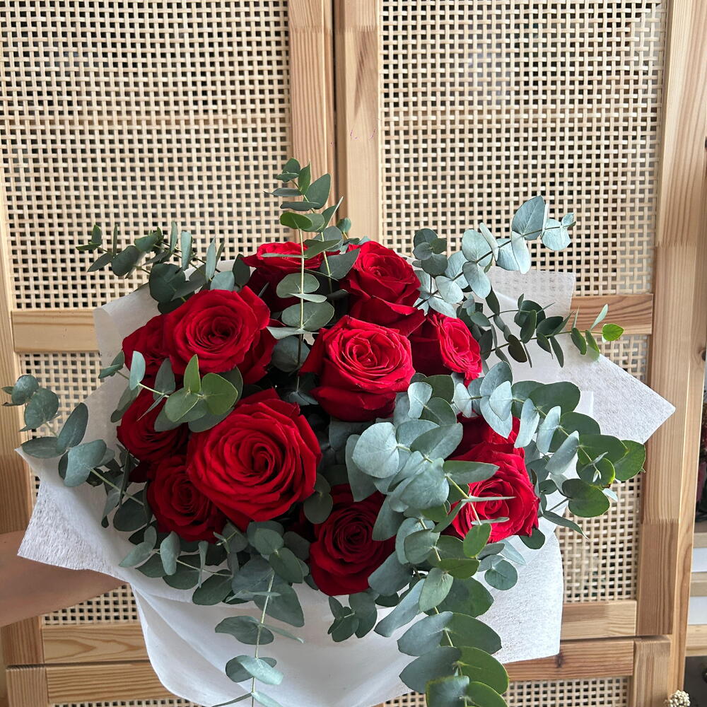 Ramo elegante y expresivo compuesto por rosas rojas intensas acompañadas de abundantes verdes variados tipo eucalipto, que aportan volumen, frescura y un estilo natural muy actual. La composición presenta una estructura equilibrada y aireada, envuelta en papel claro que realza el contraste entre el rojo profundo de las flores y los tonos verdes suaves. Este ramo de flores para regalo es ideal como flores para mujer, ramo para cumpleaños, arreglo floral romántico o flores para ocasión especial. Un ramo exclusivo de estética moderna y natural, perfecto como decoración floral moderna y detalle sofisticado que transmite pasión, elegancia y carácter.