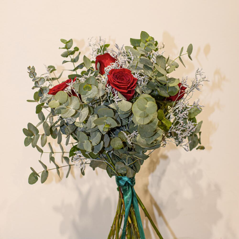 Este clásico ramo está compuesto por seis impresionantes rosas rojas, emblemáticas de amor y pasión, acompañadas por ocho ramas de eucalipto cinerea, que aportan un toque rústico y fragancia inolvidable. Para completar el conjunto, tres verdes variados añaden frescura y vibrantes texturas. Este ramo es perfecto para transmitir mensajes poderosos y emocionantes en cualquier ocasión.