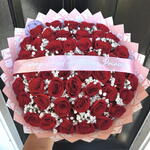rosas rojas - 75 ud. paniculata blanca - 1 ud. lazo de cinta - 1 ud. papel dior - 1 ud. cinta personalizable - 1 ud.