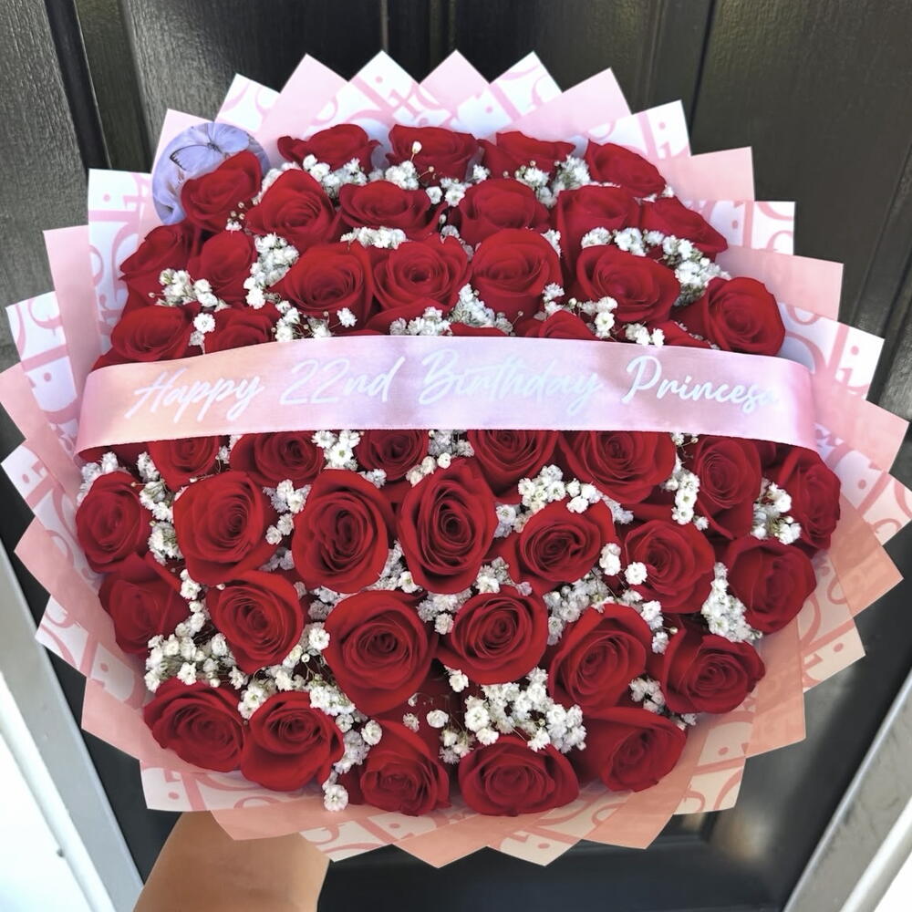 rosas rojas - 75 ud. paniculata blanca - 1 ud. lazo de cinta - 1 ud. papel dior - 1 ud. cinta personalizable - 1 ud.