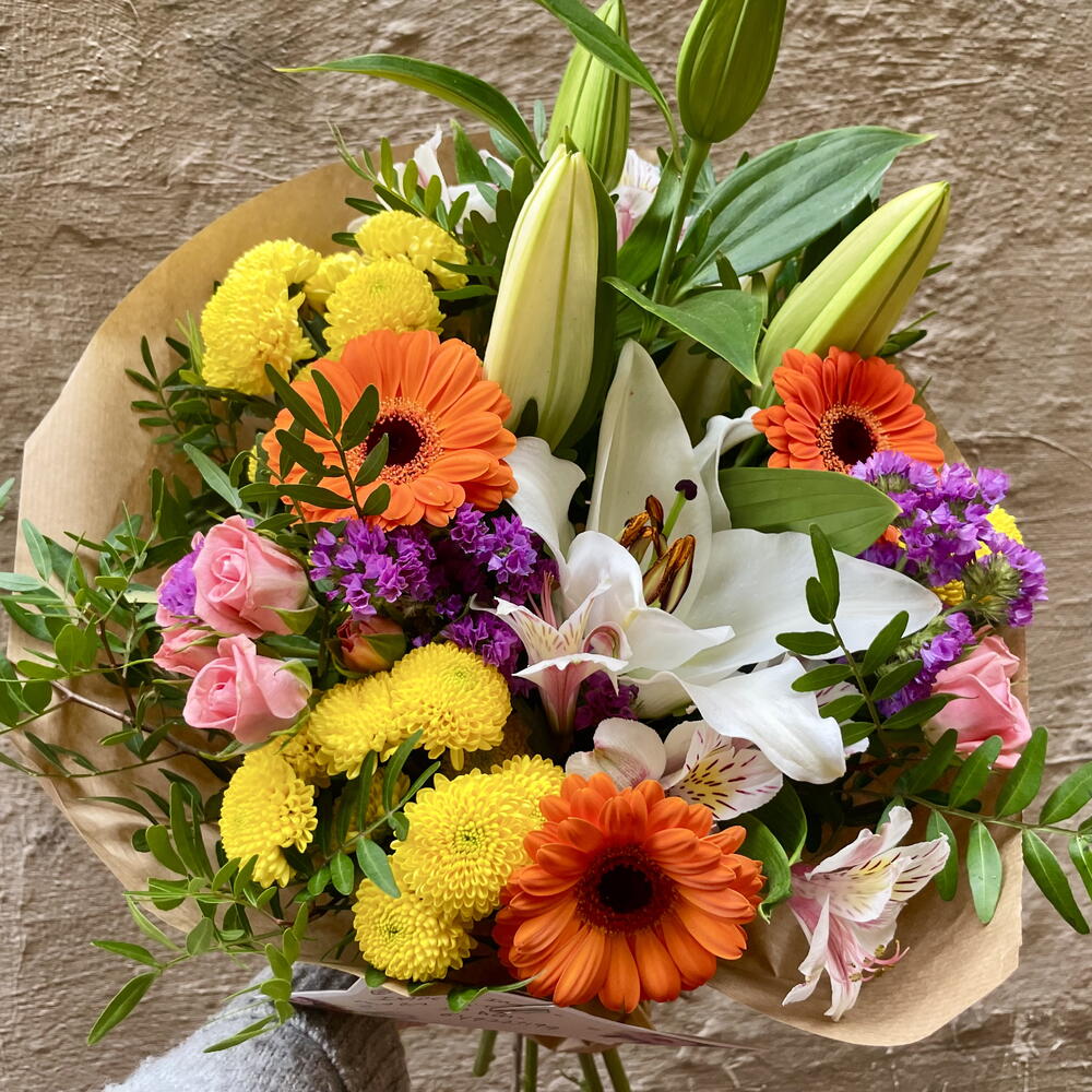 Gerbera - 3 ud. rosas ramificadas - 2 ud. verdes variados - 12 ud. lilium oriental - 1 ud. astromelia - 2 ud.