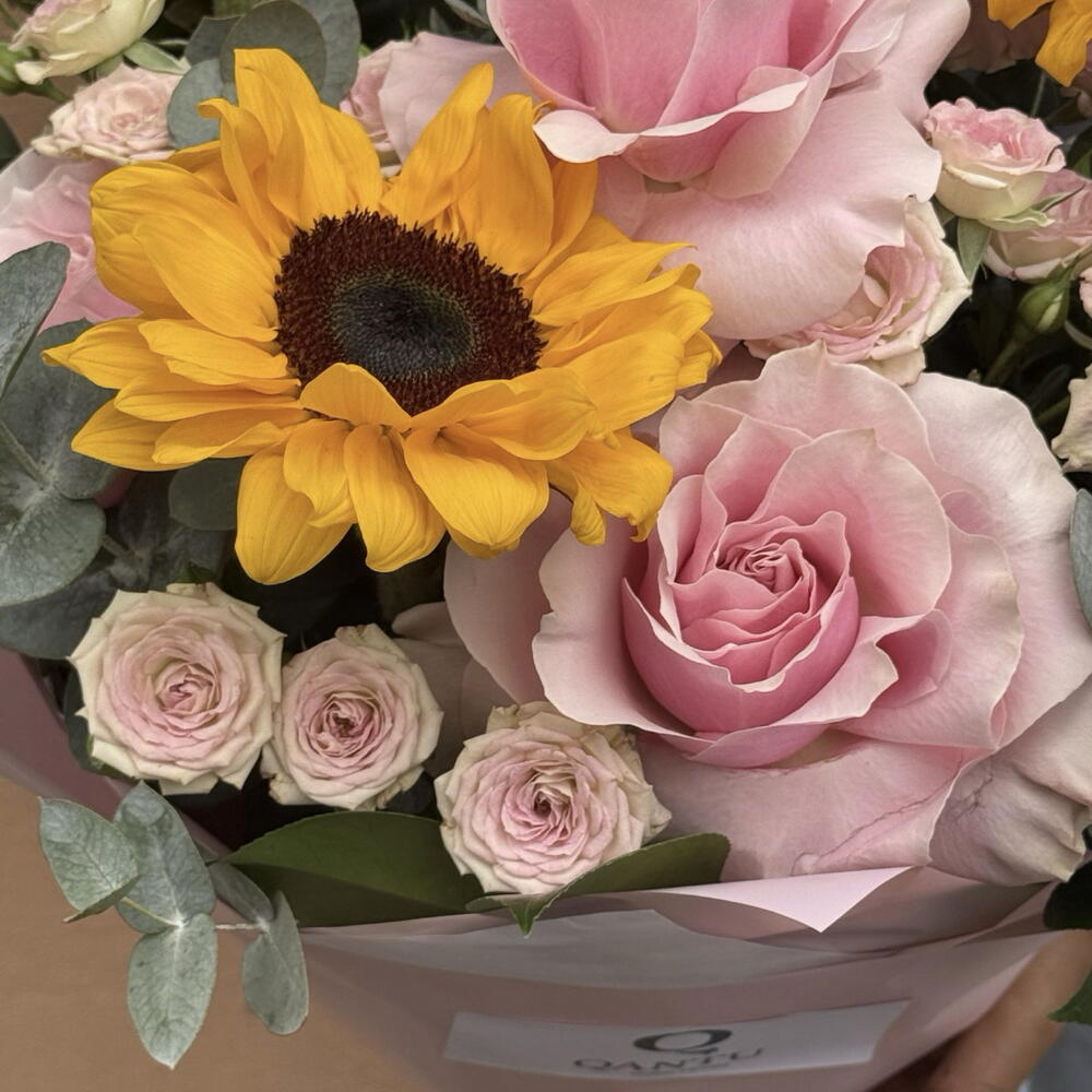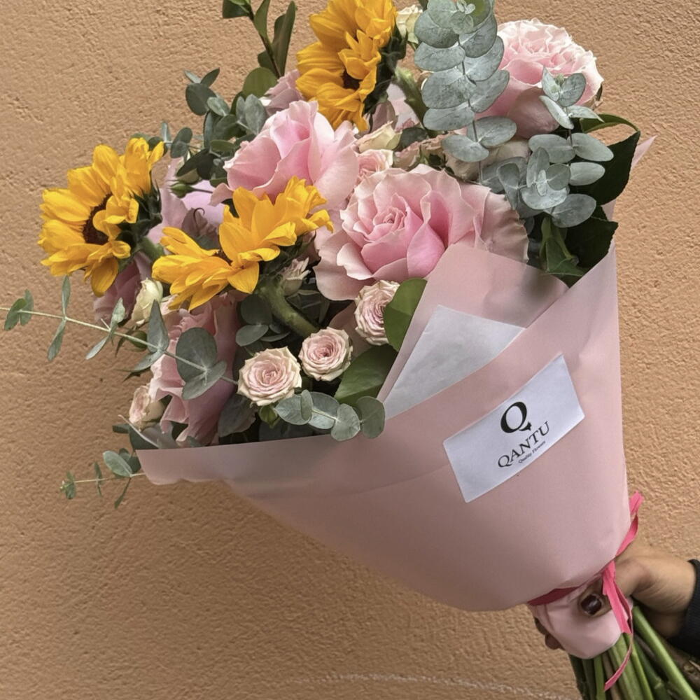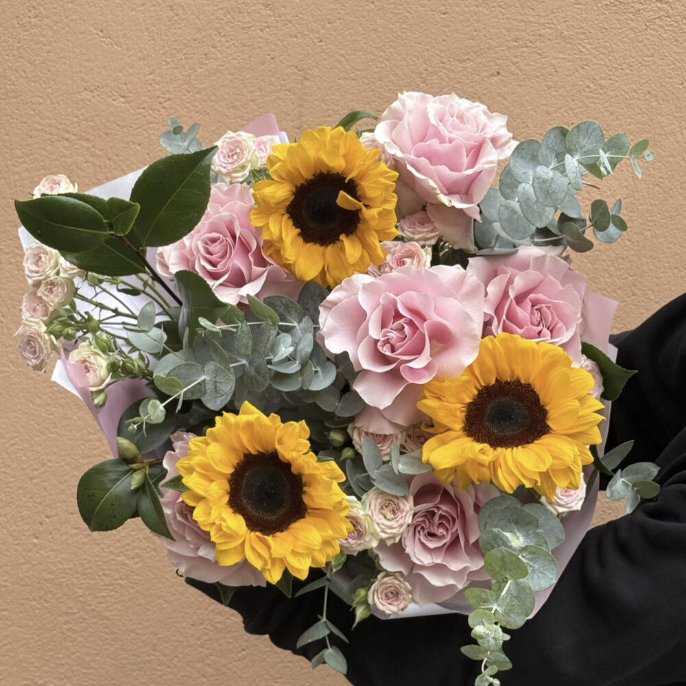 eucalipto - 6 ud. rosas ramificadas - 5 ud. rosas rosas - 5 ud. girasoles - 3 ud.