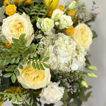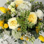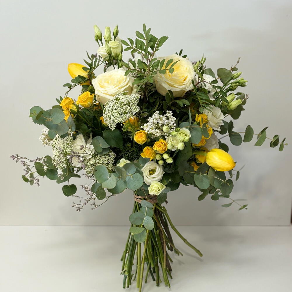 hortensia - 2 ud. Eucaliptus - 6 ud. paniculata - 5 ud. rosas blancas - 3 ud. rosa blanca - 3 ud. pitimini roses - 3 ud. flor amarilla de temporada - 5 ud.