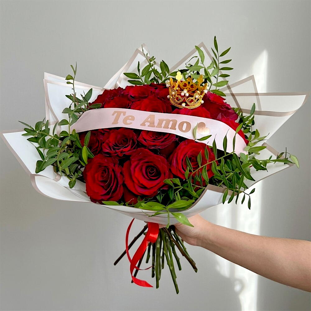 rosas rojas - 18 ud. corona - 1 ud. lentisco o similar - 3 ud. cinta te amo - 1 ud.