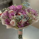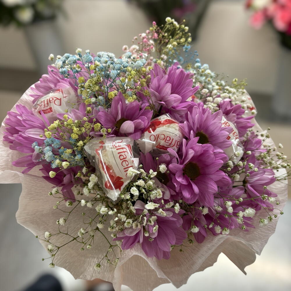 Este encantador Ramos clásicos está compuesto por 5 Margaritas lilas, cuyo color púrpura encantadoramente intenso dará vida y frescura a cualquier espacio. Se complementa con 2 Paniculatas de colores, añadiendo diversidad y vibración al ramo. También incluye 6 deliciosos Raffaello, envueltos en papel pinocho, que proporcionan un toque de dulzura e indulgencia. Cada componente de este producto ha sido cuidadosamente seleccionado para garantizar la máxima satisfacción y disfrute. Ideal para cualquier ocasión, este Ramos Clásicos es el regalo perfecto para demostrar tu afecto.