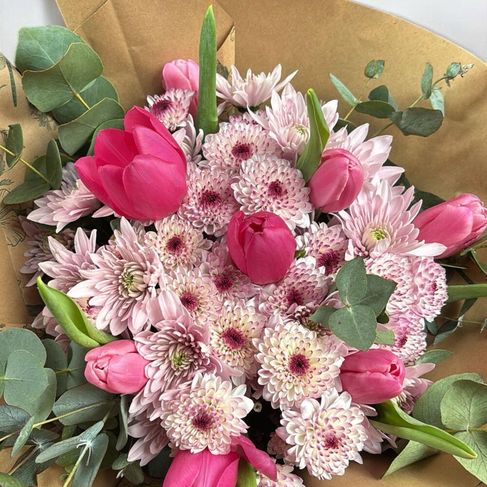 Este encantador ramo De autor se compone de una sublime mezcla de 8 tulipanes y 8 margaritas, elegidos cuidadosamente por nuestros expertos floristas. Completan el ramo 5 ramas de eucalipto, añadiendo un toque verde y fresco. Este precioso arreglo floral es perfecto para cualquier ocasión, prometiendo transmitir tus sentimientos más profundos a través de su belleza natural y su fragancia incomparable.