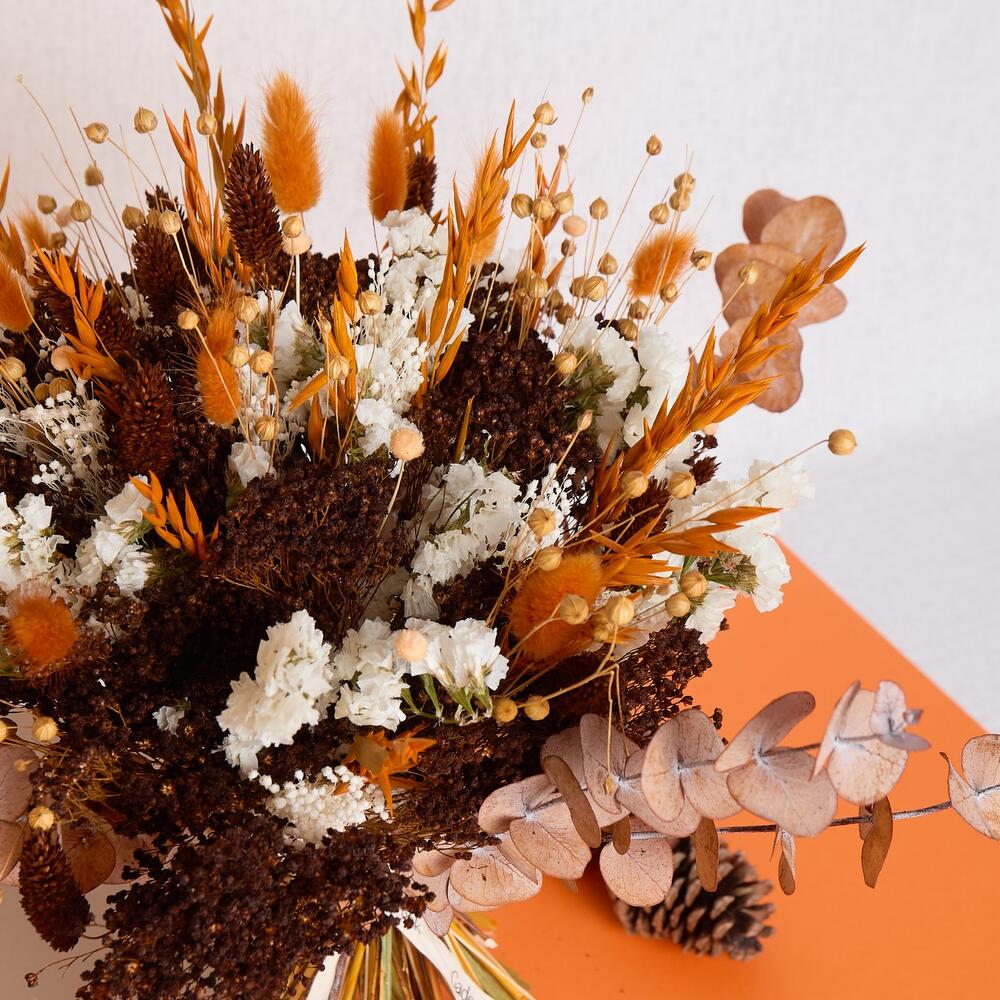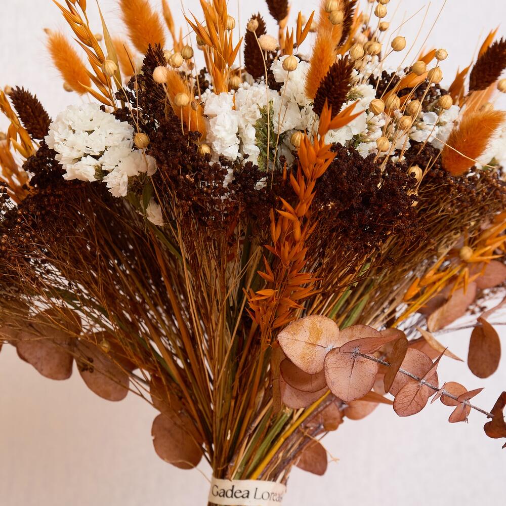 tallos de statice blanco - 4 ud. tallos de phalaris marrón - 6 ud. espigas de avena naranja - 5 ud. tallos de broom marrón - 3 ud. cabezas de lagurus naranja - 5 ud. tallos de amarelino salmón - 3 ud. ramitas de eucalipto marrón - 3 ud. tallos de lino natural - 3 ud.