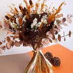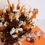 Este hermoso ramo de flores preservadas consiste en un fascinante arreglo de tallos de phalaris marrón, espigas de avena naranja, tallos de statice blanco, tallos de broom marrón, cabezas de lagurus naranja, tallos de amarelino salmón, ramitas de eucalipto marrón y tallos de lino natural. Una excelente elección para dar un toque de elegancia y frescura a cualquier espacio. Cada componente de este arreglo ha sido cuidadosamente seleccionado y preservado para mantener su belleza y vitalidad durante mucho tiempo.