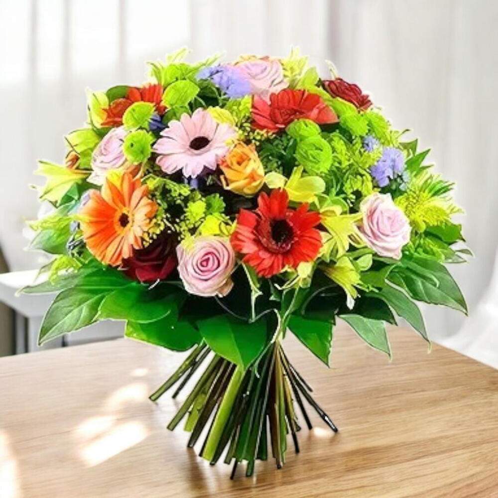 Este espectacular ramo multicolor es una celebración de alegría y vitalidad. Con una exquisita mezcla de rosas, gerberas y flores de temporada en tonos vibrantes como el rojo, naranja, amarillo y lila, es perfecto para iluminar cualquier ocasión especial. Su diseño armonioso y lleno de vida lo hace ideal para cumpleaños, aniversarios o simplemente para alegrar el día de alguien querido. Cada flor ha sido cuidadosamente seleccionada para crear un arreglo lleno de frescura y belleza natural. ¡Regala este ramo y transmite un mensaje de felicidad y amor inolvidable! Ramo de flores variado de diferentes colores