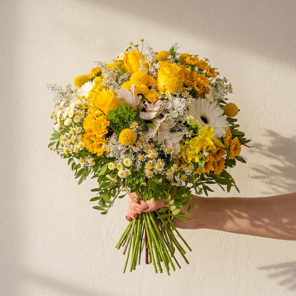 Ramo vibrante y lleno de luz en tonos amarillos y blancos que transmiten energía positiva y alegría. Las elegantes rosas amarillas se combinan con crisantemos, craspedia y delicada manzanilla, creando una composición fresca, natural y muy armoniosa. La presencia de gerbera blanca y alstroemerias aporta contraste y volumen, mientras que los verdes decorativos completan un bouquet equilibrado y lleno de vida. Perfecto para ella, para una chica, para una amiga o para alguien especial. Ideal en regalo, para cumpleaños, para felicitar, para sorprender, para transmitir alegría o para un detalle lleno de color y energía positiva. Una excelente opción si buscas ramo de flores amarillas, bouquet alegre y luminoso, flores para regalar felicidad, arreglo floral colorido, ramo natural y fresco o flores con entrega a domicilio. 🌼✨