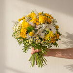 alstroemerias - 2 ud. craspedia - 3 ud. paniculata - 3 ud. rosas amarillas - 4 ud. Gerbera blanca - 1 ud. manzanilla - 4 ud. crisantemos amarillos - 4 ud. verdes decorativos variados - 5 ud.