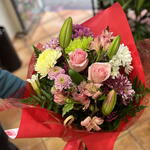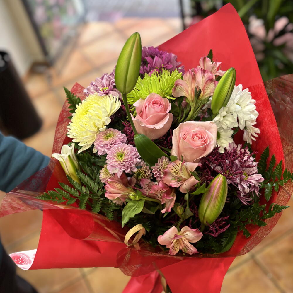Este bouquet de autor es una preciosa amalgama de flores. Con 2 liliums que deslumbran con su elegancia, dos rosas que aportan un toque de amor, una margarita simbolizando inocencia pura, 2 astromelias destacando belleza y amistad, un crisantemo evocando alegría y una variada selección de 5 verdes que añaden frescura y diversidad, es el complemento perfecto para cualquier momento. Un gesto de agradecimiento, de amor, de simpatía... este bouquet no sólo es una composición floral, es la expresión perfecta de tus sentimientos.
