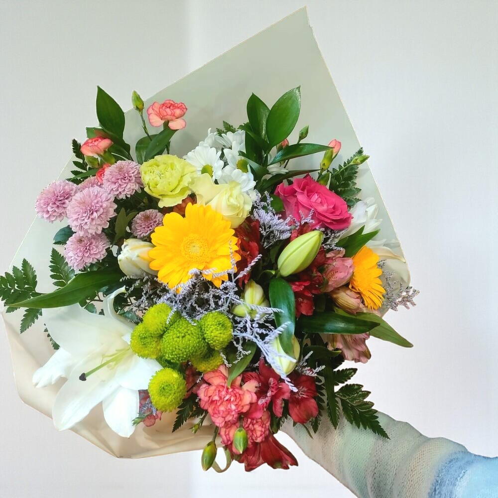 Lisianthus - 2 ud. alstroemerias - 2 ud. rosas - 3 ud. claveles - 3 ud. verdes decorativos - 4 ud. crisantemos - 6 ud. lirio blanco - 1 ud. Gerbera amarillas - 2 ud. estatice lila - 1 ud.