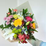 Un ramo lleno de color y alegría que ilumina cualquier ocasión. Sus gerberas amarillas y rosas fucsias contrastan con los suaves tonos de crisantemos y claveles, mientras los lirios blancos aportan elegancia y frescura. Ideal para cumpleaños, agradecimientos o para transmitir energía positiva en cualquier momento. Para mantener su belleza por más tiempo, coloque el ramo en un jarrón con agua limpia, cambie el agua cada dos días y corte los tallos en diagonal. Evite la exposición directa al sol y las corrientes de aire.