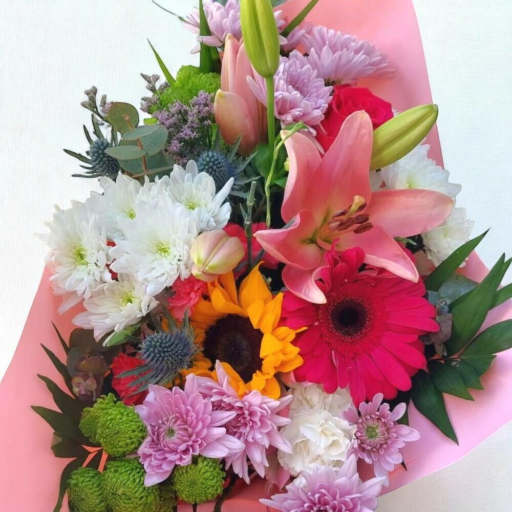 Este vibrante ramo multicolor es un estallido de alegría y energía. Perfecto para celebrar ocasiones especiales o para iluminar cualquier día con su mezcla única de flores. Los tonos cálidos del girasol y las gerberas contrastan con la suavidad de los crisantemos, lirios y claveles. La frescura del follaje y los toques azules del cardo aportan textura y elegancia. Coloca el ramo en un jarrón limpio con agua fresca, cambiándola cada 2 días. Recorta los tallos en diagonal antes de ponerlo en el agua y evita la luz solar directa y corrientes de aire. Retira las flores marchitas para prolongar la frescura del conjunto.