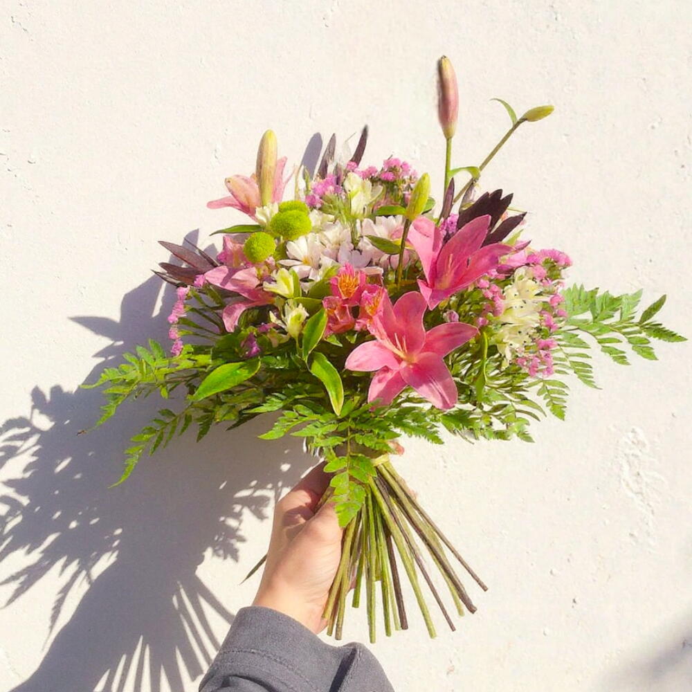 alstroemerias - 4 ud. margaritas - 6 ud. verdes variados - 5 ud. lilium rosa - 2 ud.