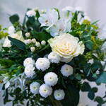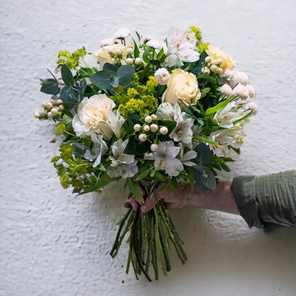 Ramo de flores frescas en tonos blancos y verdes. Flores : Rosas, Alstromelias, Tanacetum, Hypericum y diferentes variedades de verdes.