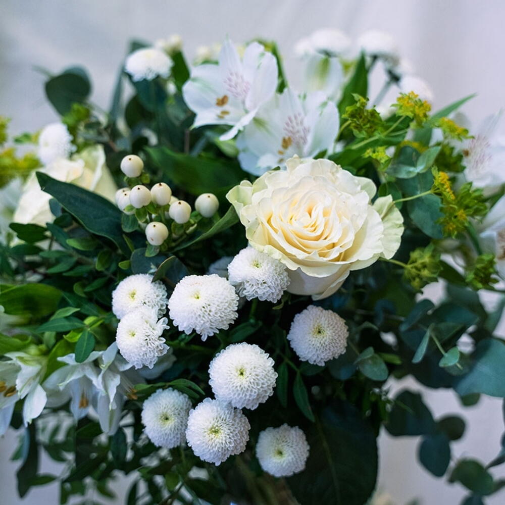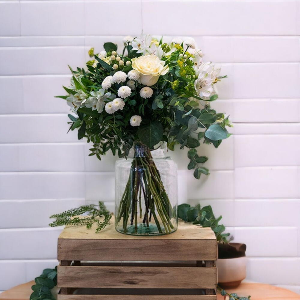 hypericum - 3 ud. tanacetum - 3 ud. eucalipto - 5 ud. buplerum - 4 ud. rosas blancas - 4 ud. alstroemeria blanca - 4 ud.