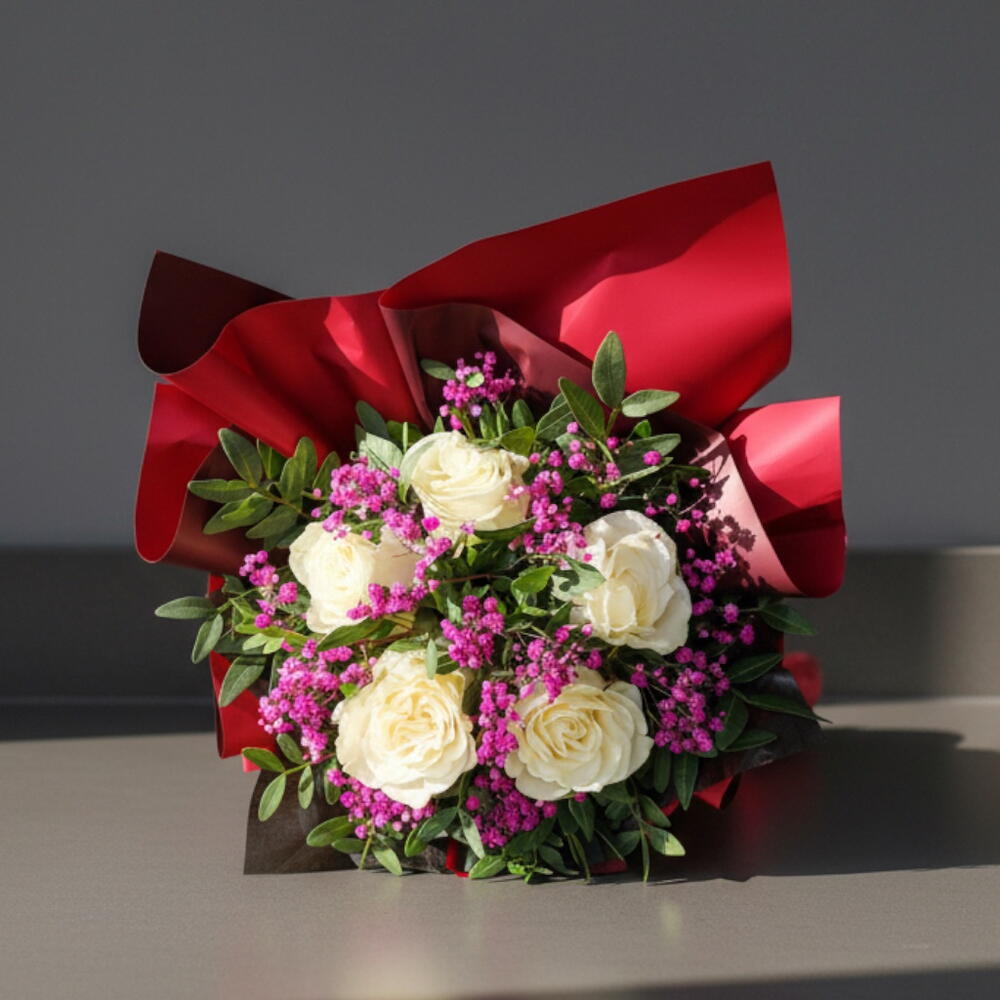 El Ramo Elegancia Blanca con Toques Fucsia es una creación floral perfecta para regalar en cumpleaños, aniversarios, agradecimientos o cualquier ocasión especial. Su delicada combinación de rosas blancas frescas, acompañadas de flores fucsia paticulata y el follaje verde de pistacia, crea un contraste vibrante y sofisticado. El arreglo viene perfectamente presentado en papeles decorativos y montado sobre esponja floral con agua para asegurar mayor frescura. Un detalle exclusivo y elegante que transmite pureza, cariño y estilo.