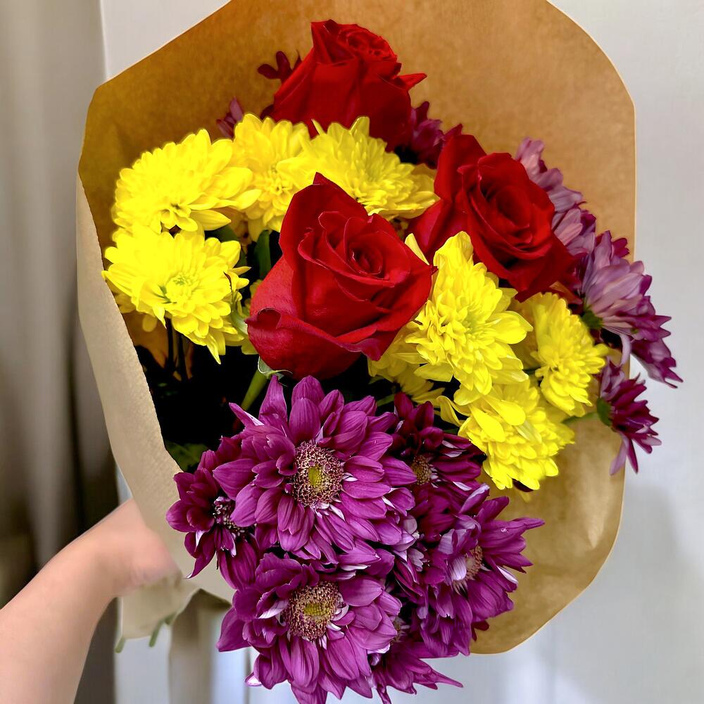 Un vibrante ramo que combina la intensidad de las rosas rojas, la calidez de los crisantemos amarillos y la elegancia de las flores moradas. Este arreglo floral irradia energía, alegría y pasión, siendo perfecto para celebraciones especiales o para iluminar cualquier espacio con su colorido. Cada flor ha sido seleccionada cuidadosamente para garantizar frescura y una presentación impecable. Envuelto en un papel kraft natural, este ramo es un regalo que expresa emociones sinceras y duraderas. ¡Un detalle lleno de vida que dejará una impresión inolvidable!