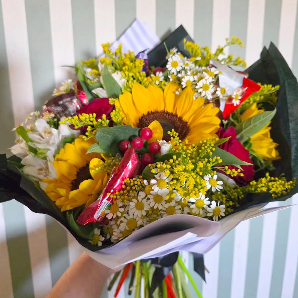 Rayo de Sol con Dulzura es un ramo que irradia alegría y vitalidad, perfecto para iluminar cualquier día especial. Los girasoles vibrantes simbolizan felicidad y energía positiva, mientras que las margaritas y las rosas rojas aportan dulzura y pasión. Como detalle encantador, este ramo incluye pequeños chocolates envueltos, convirtiéndolo en una deliciosa sorpresa floral. Ideal para cumpleaños, agradecimientos o simplemente para hacer sonreír a alguien querido. Cada elemento está cuidadosamente envuelto en un elegante papel negro y blanco, destacando aún más los colores cálidos del interior. Este ramo es una explosión de emociones, flores y sabor.