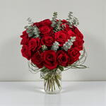 This elegant bouquet of red roses is a timeless expression of love, passion, and admiration. Deep red blooms are carefully arranged to create a full, rounded shape, while fresh eucalyptus adds a modern touch and a subtle, refreshing aroma. The contrast between the velvety roses and soft green foliage makes the bouquet look rich and sophisticated. It is perfect for romantic gestures, anniversaries, birthdays, or meaningful celebrations. The bouquet is designed to look beautiful from every angle and suits both classic and contemporary interiors. For best longevity, keep the flowers in clean water, trim the stems regularly, and place the bouquet away from direct sunlight and heat sources.