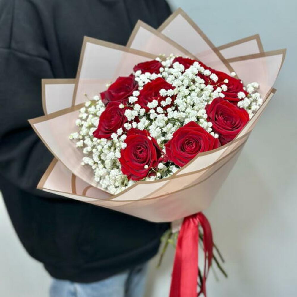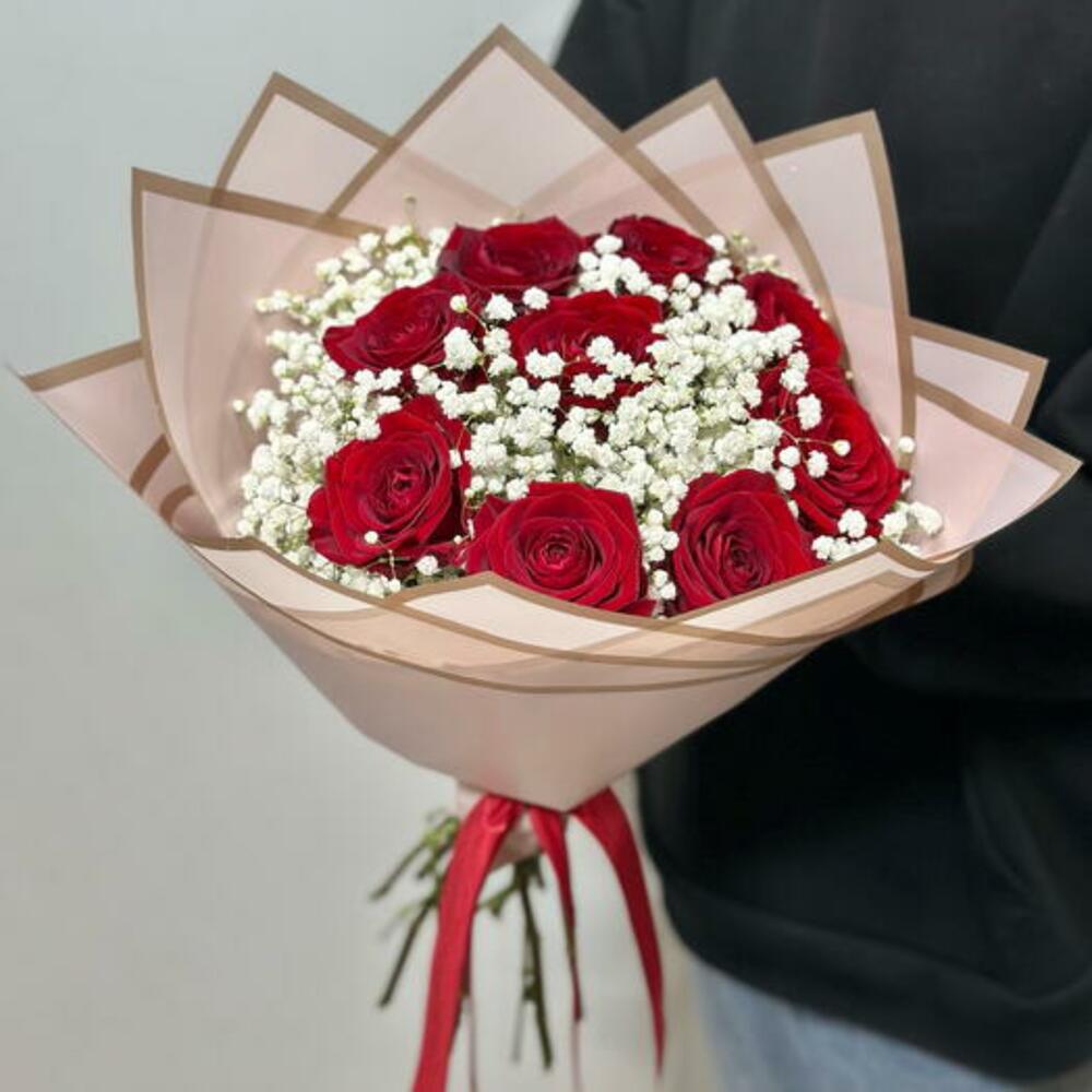Red rose - 9 ud. packaging - 1 ud. white gypsophila - 8 ud.