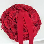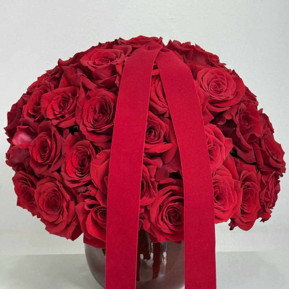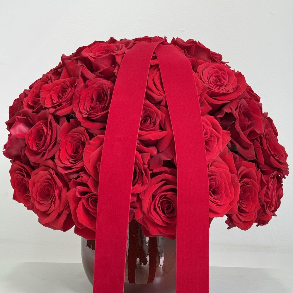 lazo rojo - 1 ud. rosas rojas - 71 ud. macetero granate - 1 ud.