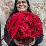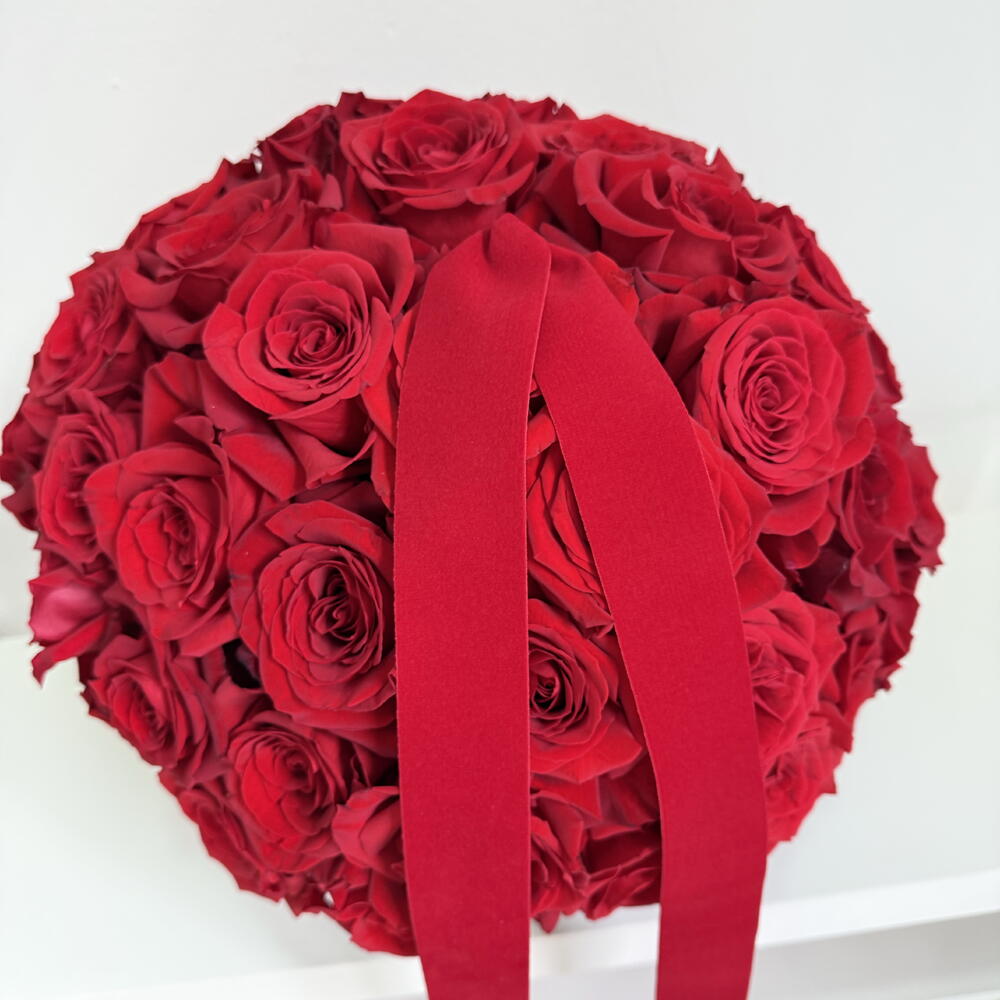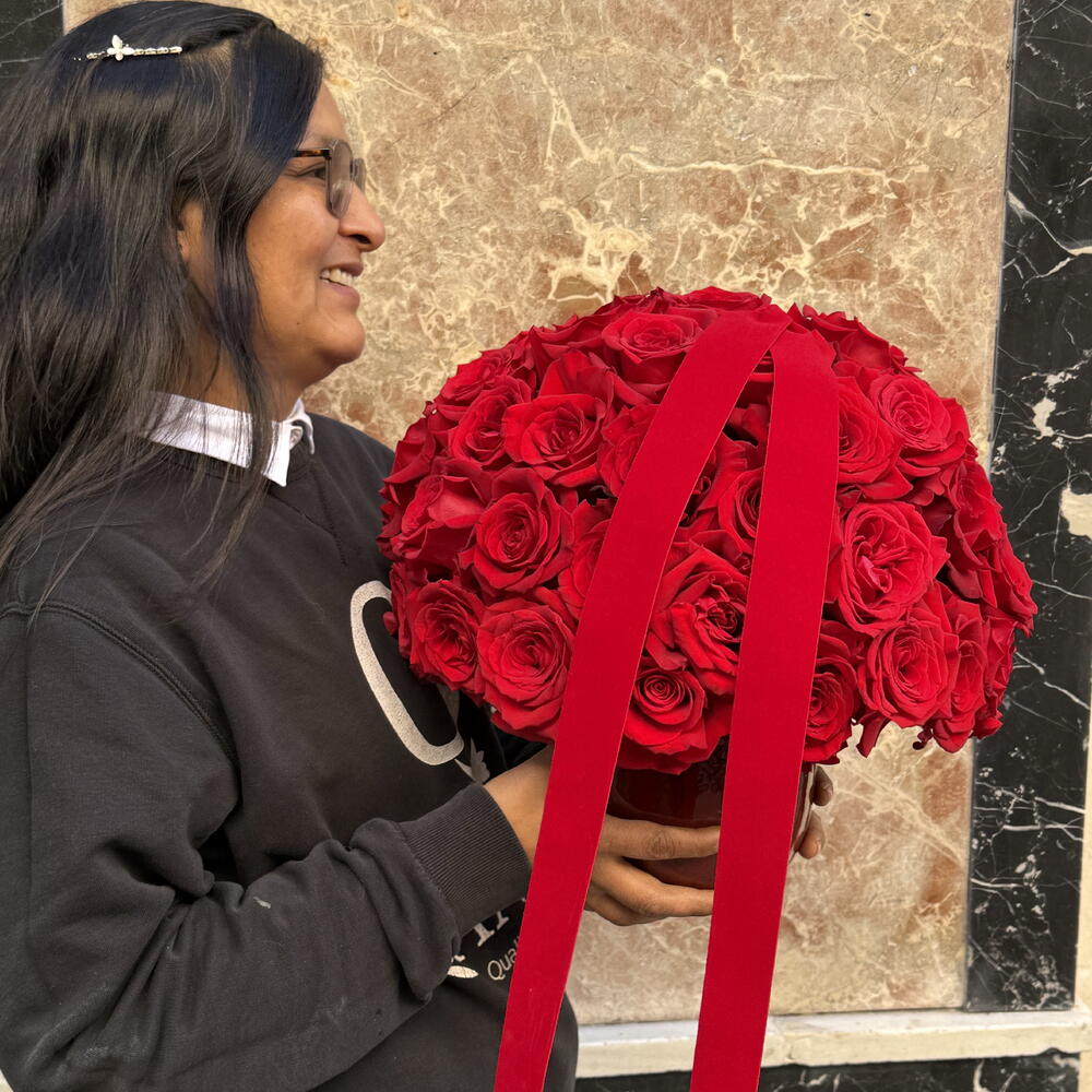 Centro floral de rosas rojas premium, realzadas con delicados toques de eucalipto natural, dispuestas en una elegante base de cerámica granate. Una composición sofisticada y equilibrada que transmite carácter, distinción y belleza atemporal. Un diseño exclusivo Qantu, pensado para quienes valoran el lujo sutil y la excelencia floral.