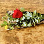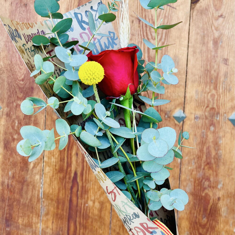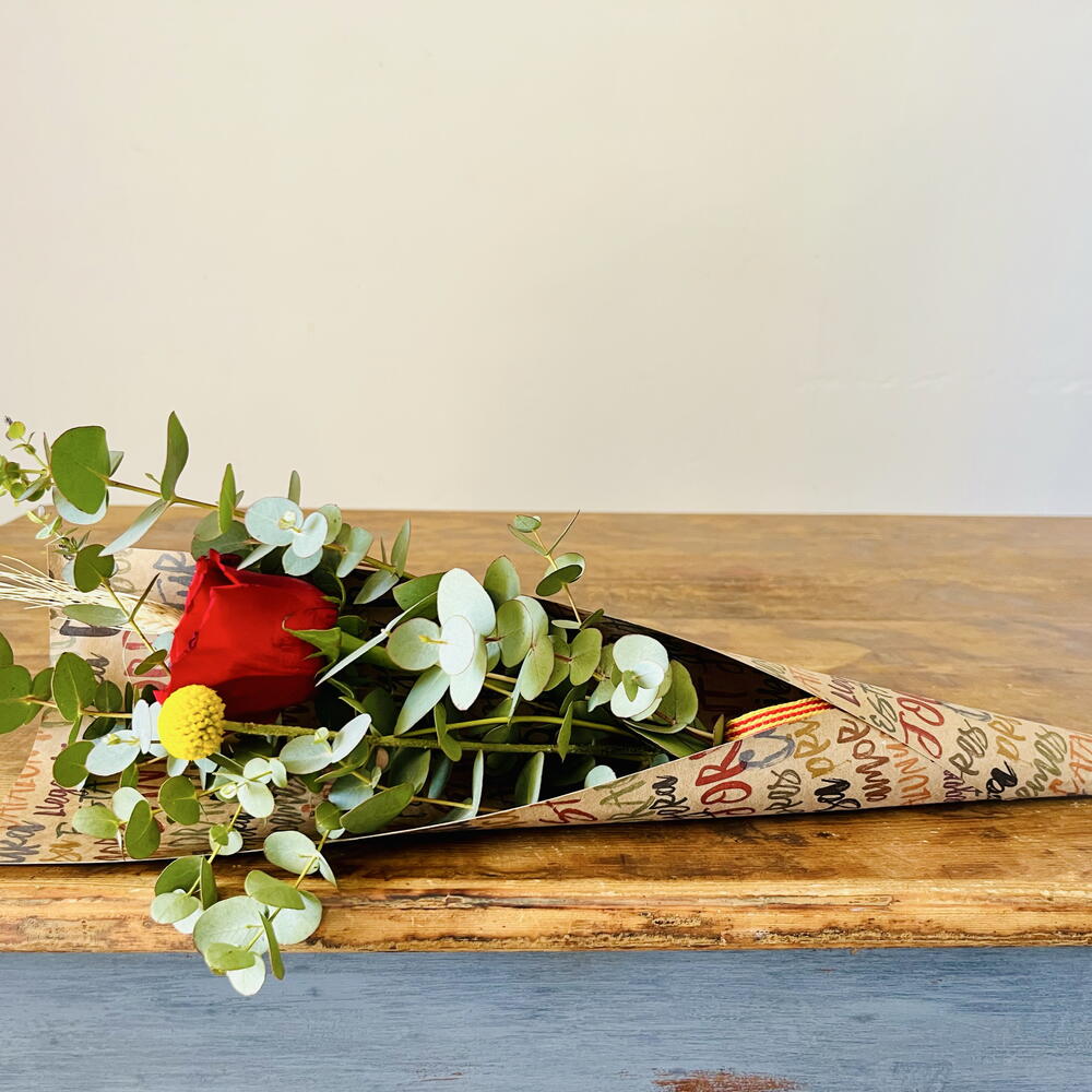 Eucalyptus - 5 ud. rosa roja - 1 ud. espiga - 1 ud. craspedia amarilla - 1 ud. cono kraft - 1 ud.