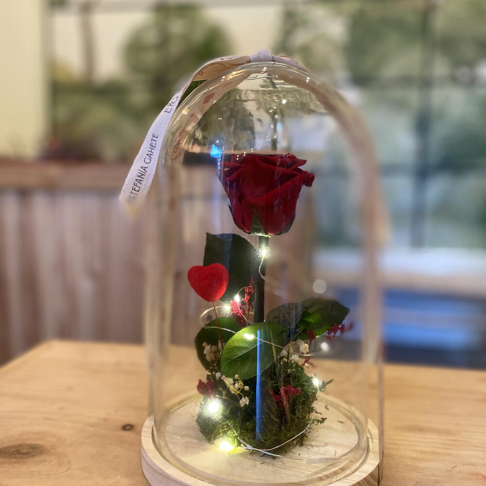 cupula - 1 ud. rosa preservada roja - 1 ud. pick corazón - 1 ud. papel celofan - 1 ud. luces led - 1 ud. lazada decorativa - 1 ud.