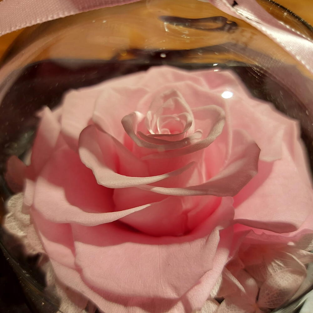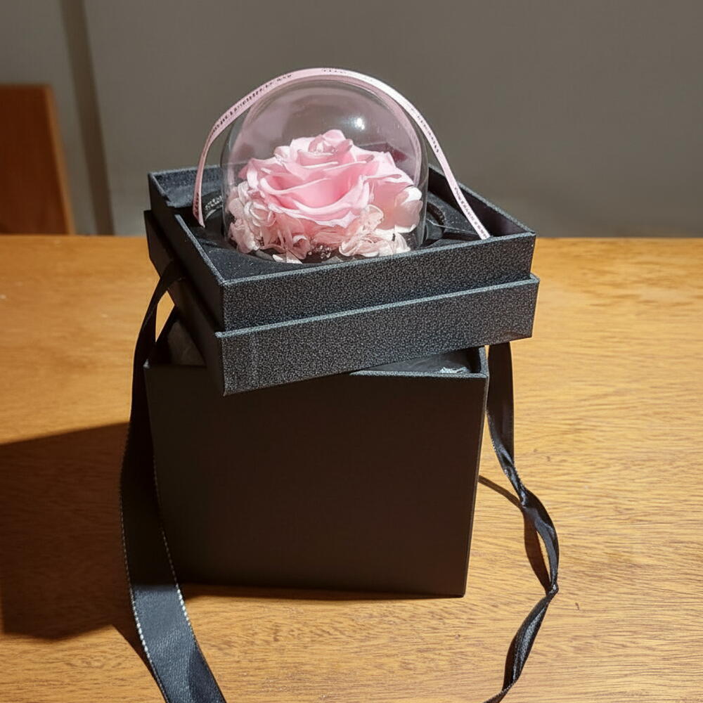 Una joya floral que combina elegancia y ternura en una presentación perfecta. Esta rosa preservada en suave tono rosa descansa bajo una delicada cúpula transparente, simbolizando la belleza eterna. Su caja negra con acabado brillante y cintas de satén aporta un toque de lujo y sofisticación. Ideal para regalar en ocasiones especiales como aniversarios, cumpleaños o simplemente para decir “te quiero”. Cada detalle ha sido pensado para transmitir amor, delicadeza y elegancia. Un regalo que no solo decora, sino que emociona y perdura en el tiempo.