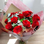 Hermoso ramo de 12 rosas rojas freedom fresca y duradera con toques de paniculata blanca y verdes variados. El regalo perfecto para esa personita que está en tu vida ❤️.