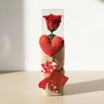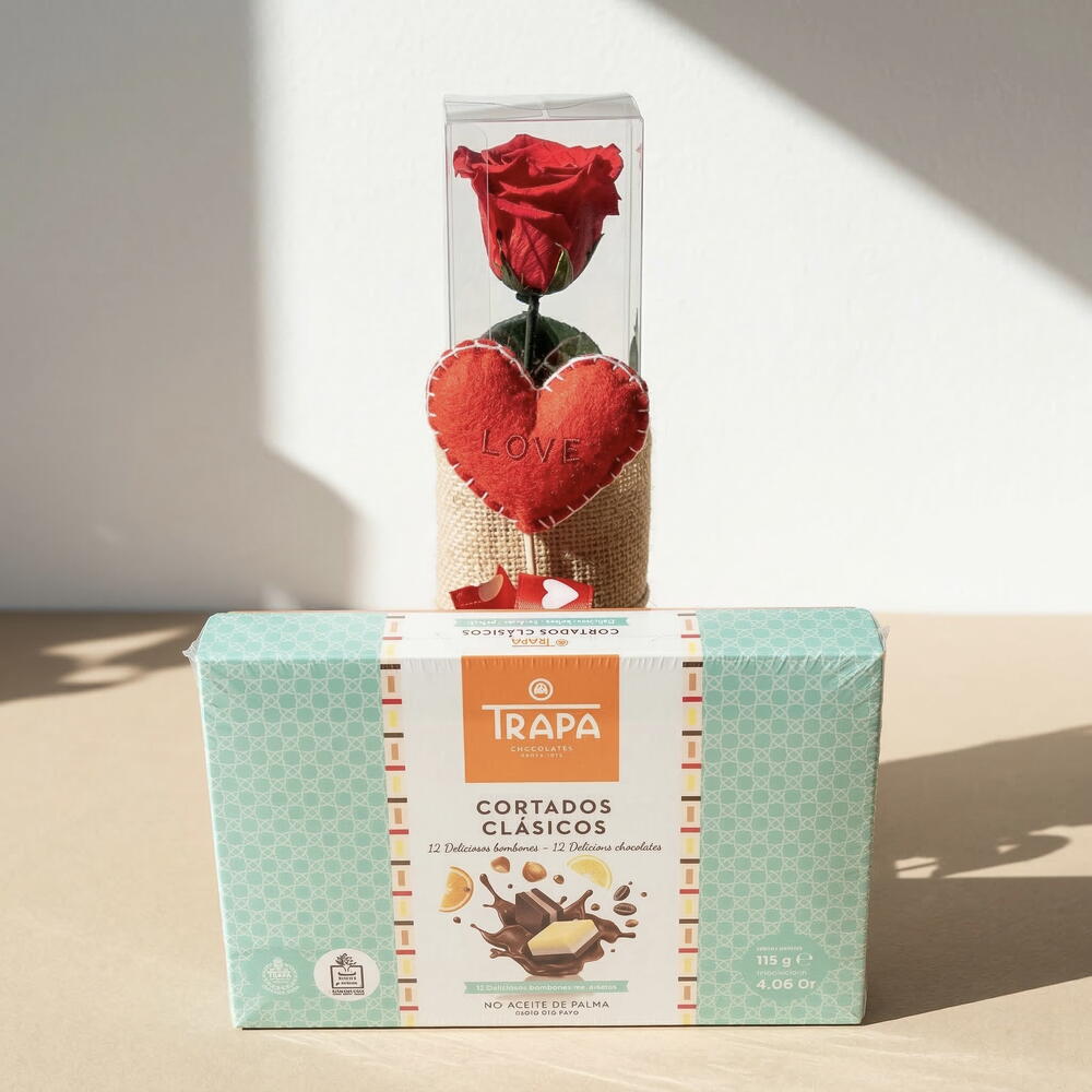 Un regalo romántico y original que combina belleza y dulzura en un solo detalle. La elegante rosa roja preservada simboliza amor eterno y sentimientos profundos, convirtiéndose en el centro de esta encantadora composición. El pequeño corazón decorativo añade un toque tierno que transmite cariño y calidez. La rosa se presenta en un estuche transparente que resalta su belleza y permite conservarla durante mucho tiempo. Para completar la sorpresa, el conjunto incluye una caja de deliciosos bombones clásicos, perfectos para compartir un momento especial. Es un detalle ideal para San Valentín, aniversarios o simplemente para demostrar amor de una manera dulce y significativa. Para su cuidado, se recomienda mantener la rosa preservada en un lugar seco, lejos de la luz solar directa, la humedad y las fuentes de calor; no necesita agua y puede conservar su belleza durante mucho tiempo si se manipula con cuidado.