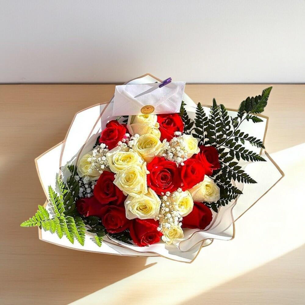 Descubre la armonía perfecta entre el amor y la pureza con este ramo de rosas rojas y blancas, diseñado para transmitir sentimientos profundos con un estilo sofisticado. Ideal para aniversarios, San Valentín, declaraciones románticas o simplemente para decir “te quiero”. Las rosas blancas simbolizan la sinceridad y la paz, mientras que las rojas representan pasión y amor eterno. Acompañadas de paniculata delicada y helecho de cuero, este arreglo floral es un acierto seguro. Recomendaciones de cuidado: Al recibir tu ramo, colócalo en un jarrón con agua limpia. Cambia el agua cada dos días y recorta los tallos en diagonal unos 2 cm para favorecer la absorción. Mantén el arreglo en un lugar fresco y evita la exposición directa al sol y corrientes de aire para conservar su frescura y color durante más tiempo.