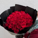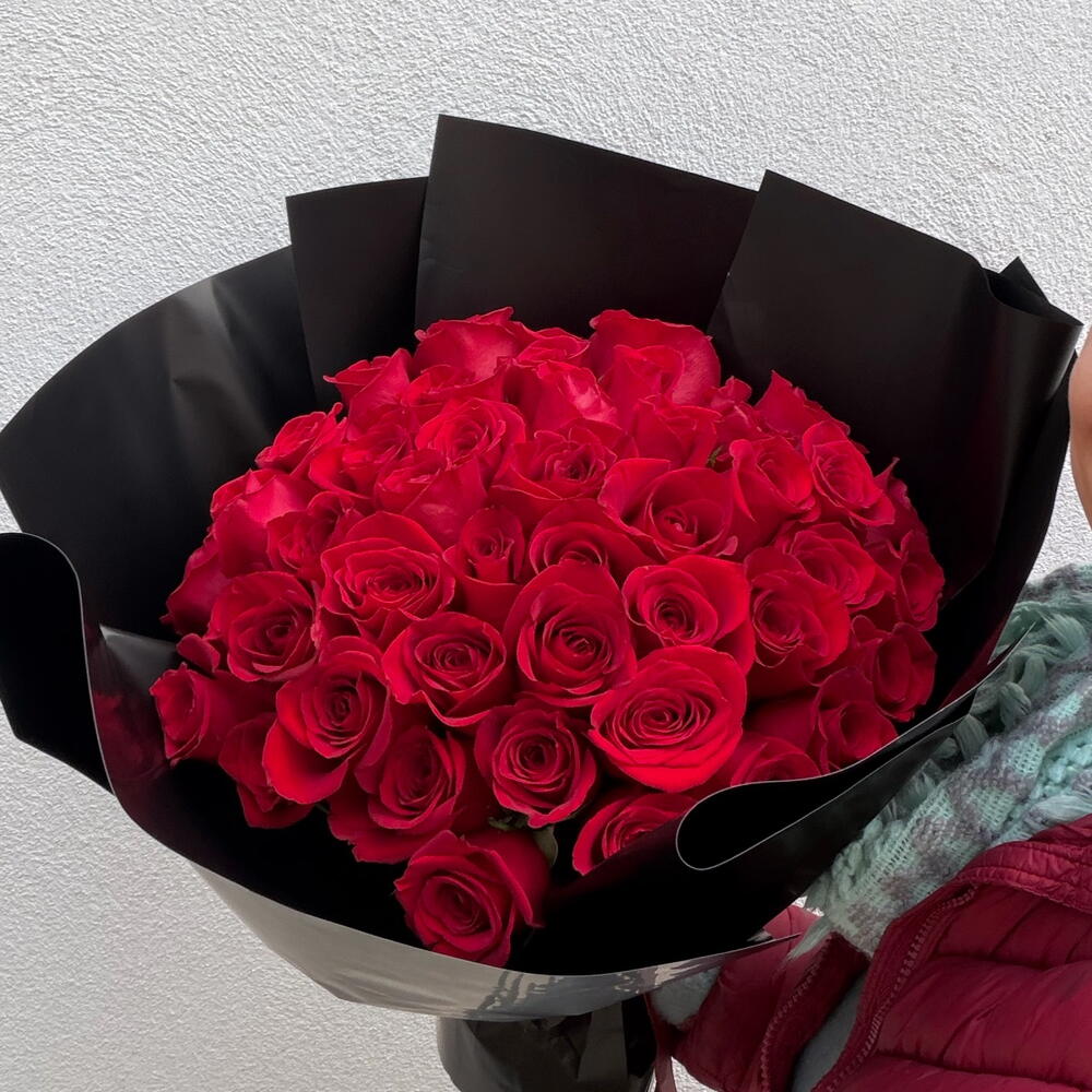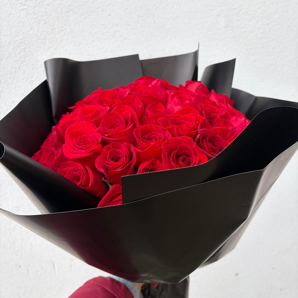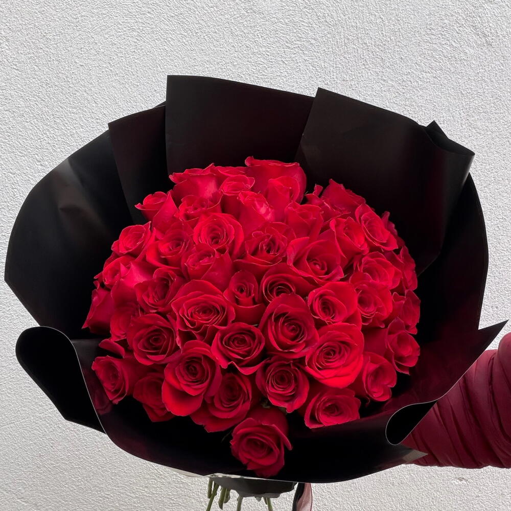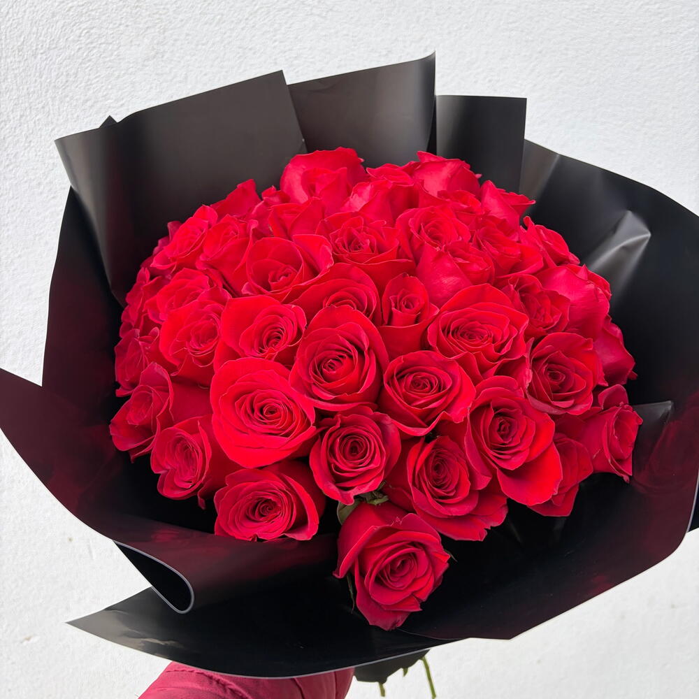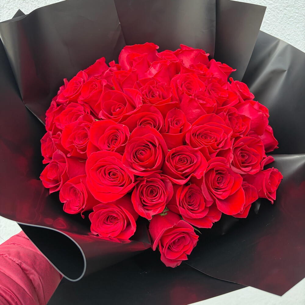 El Amor Infinito: 45 tallos de pura devoción Cuando las palabras no son suficientes, deja que El Amor Infinito hable por ti. Este impresionante arreglo es nuestra oferta más prestigiosa, un auténtico mar de 45 rosas rojas de tallo largo y calidad premium, diseñadas para conquistar el corazón por completo. Cada rosa es seleccionada a mano por su textura aterciopelada y su profunda intensidad carmesí, y luego se dispone en una espiral experta formando una densa y magnífica cúpula de color. Para enfatizar el rojo vibrante de las flores, las hemos envuelto en un sofisticado envoltorio escultórico y arquitectónico de negro azabache, creando un aspecto de alta costura y alto contraste que define el lujo moderno. • La escala: Un extraordinario recuento de 45 tallos para un impacto visual máximo. • El diseño: Una silueta de cúpula densa y uniforme — el estándar de oro de la floristería romántica. • El envoltorio: Papel premium negro mate, plegado a mano para crear un marco audaz y dramático. • La ocasión: La opción definitiva para pedidas de mano, aniversarios importantes, o el gesto más inolvidable del Día de San Valentín.