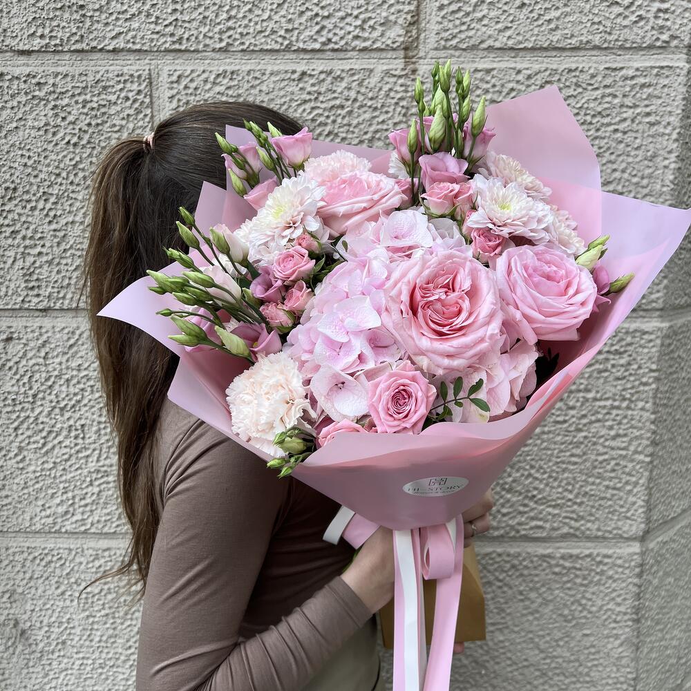 Lisianthus - 3 ud. clavel - 3 ud. rosa spray - 3 ud. hortensja - 1 ud. crisantemos - 2 ud. rosa ohara - 3 ud.