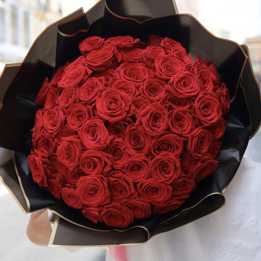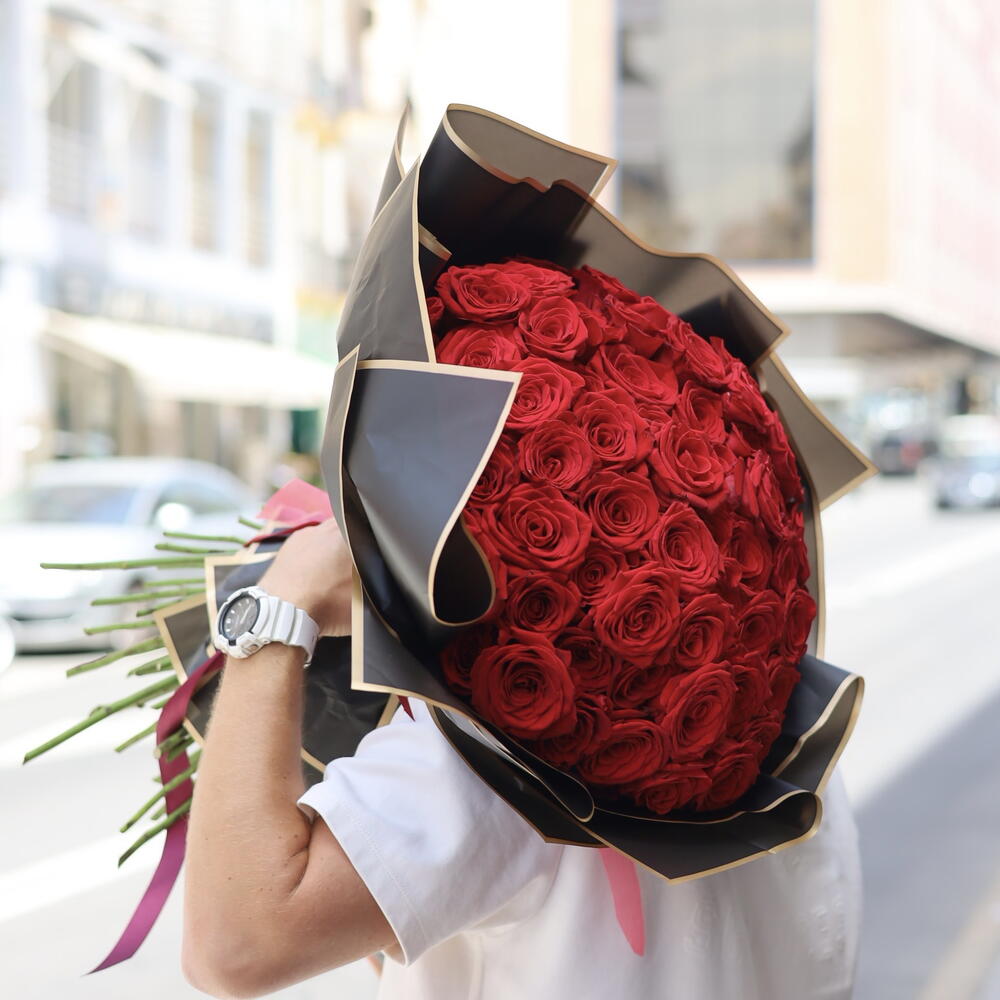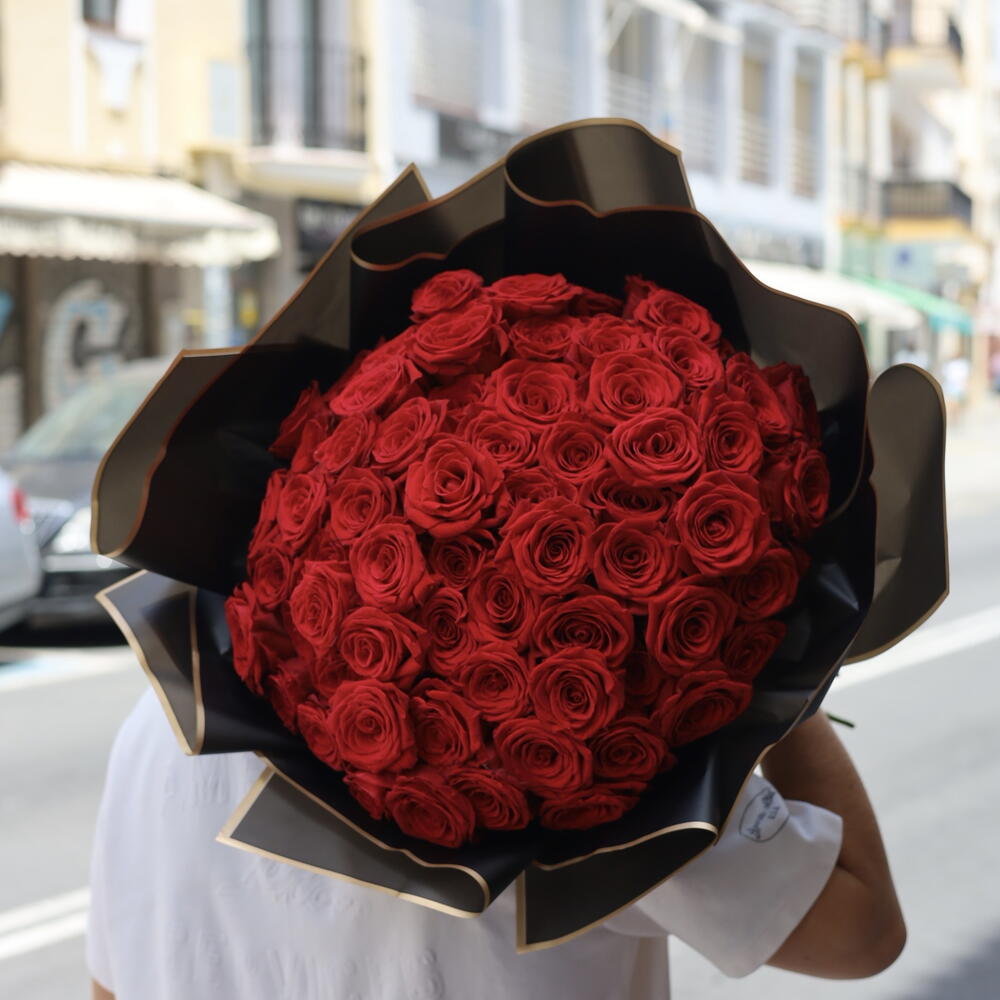 Compuesto por 75 rosas escarlatas, este exquisito monookette te transportará a un ambiente de romance y pasión. El ramo está exquisitamente decorado con seis paquetes de diseño que agregan originalidad al producto. Tres brillantes cintas decorativas complementan armoniosamente la composición, dándole un aspecto completo y sólido. Es el regalo perfecto para resaltar tu amor y atención a tu ser querido.