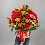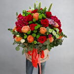 Con rosas en tonos rojos y anaranjados, crisantemos verdes y detalles de hortensias, crea una composición vibrante y sofisticada. Es perfecto para hacer una declaración de alegría y celebrar momentos memorables.
