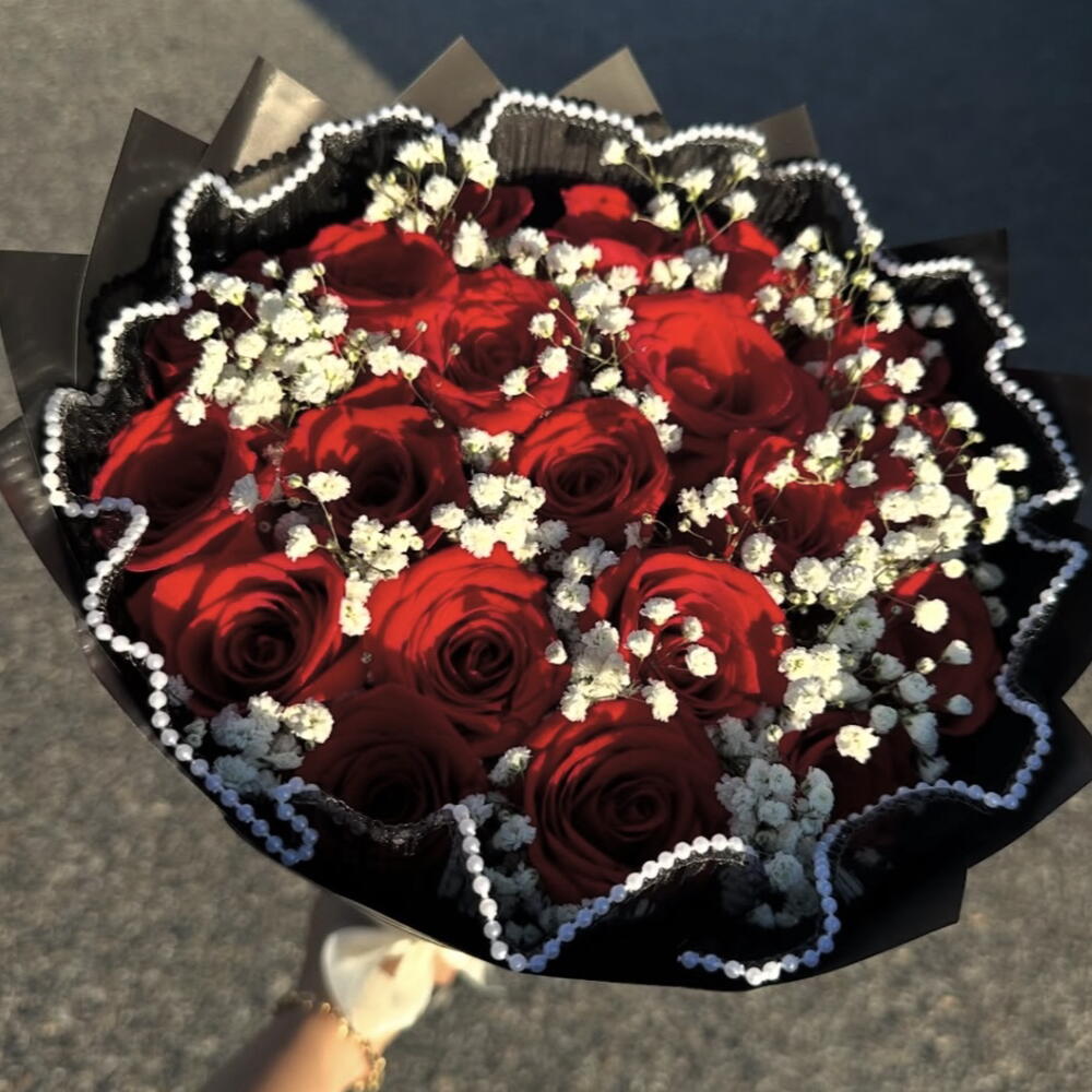 rosas rojas - 25 ud. paniculata blanca - 1 ud. lazo decorativo - 1 ud. tela con borde perla - 1 ud.