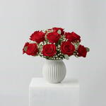 Este magnífico ramo de la categoría De autor está compuesto por 12 rosas rojas, el símbolo universal del amor apasionado. También incluye 3 unidades de Paniculata blanca, que aportan un toque de elegancia y delicadeza al conjunto. Además, las 3 unidades de eucalipto proporcionan un agradable aroma fresco y 3 piezas de verde decorativo complementan la composición, dándole un toque de naturalidad y frescura. Cada componente se ha seleccionado y organizado con cuidado para crear un ramo de carácter y estilo propios. Ideal para expresar tus sentimientos más profundos o adornar cualquier espacio.
