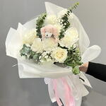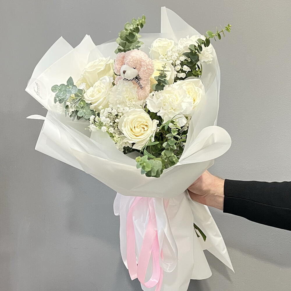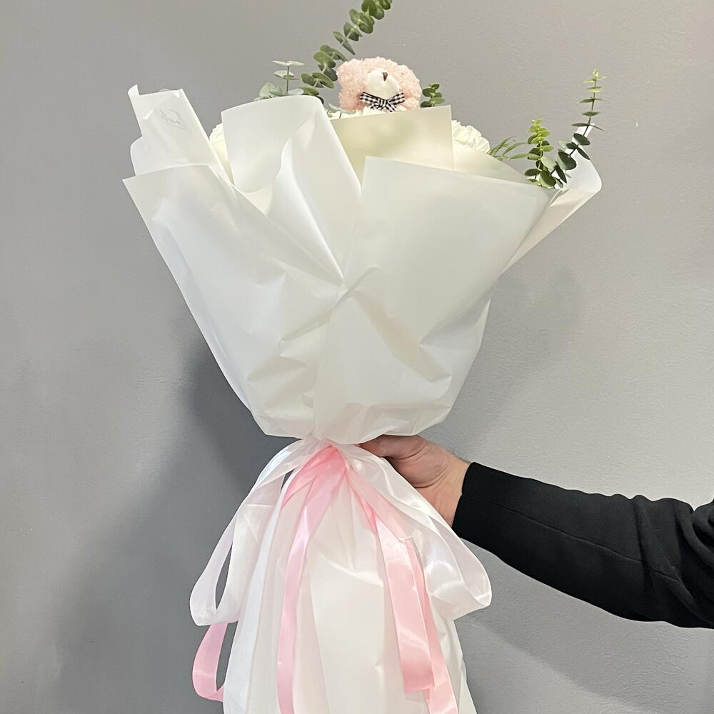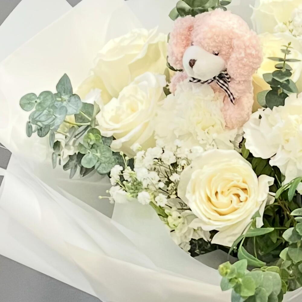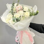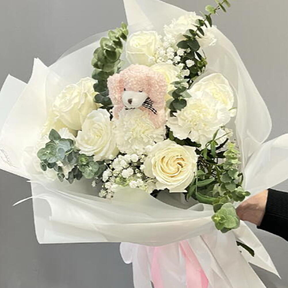 eucalipto - 4 ud. paniculata - 2 ud. rosas blancas - 8 ud. claveles blancos - 3 ud. peluche osito - 1 ud. cinta decorativa - 100 cm