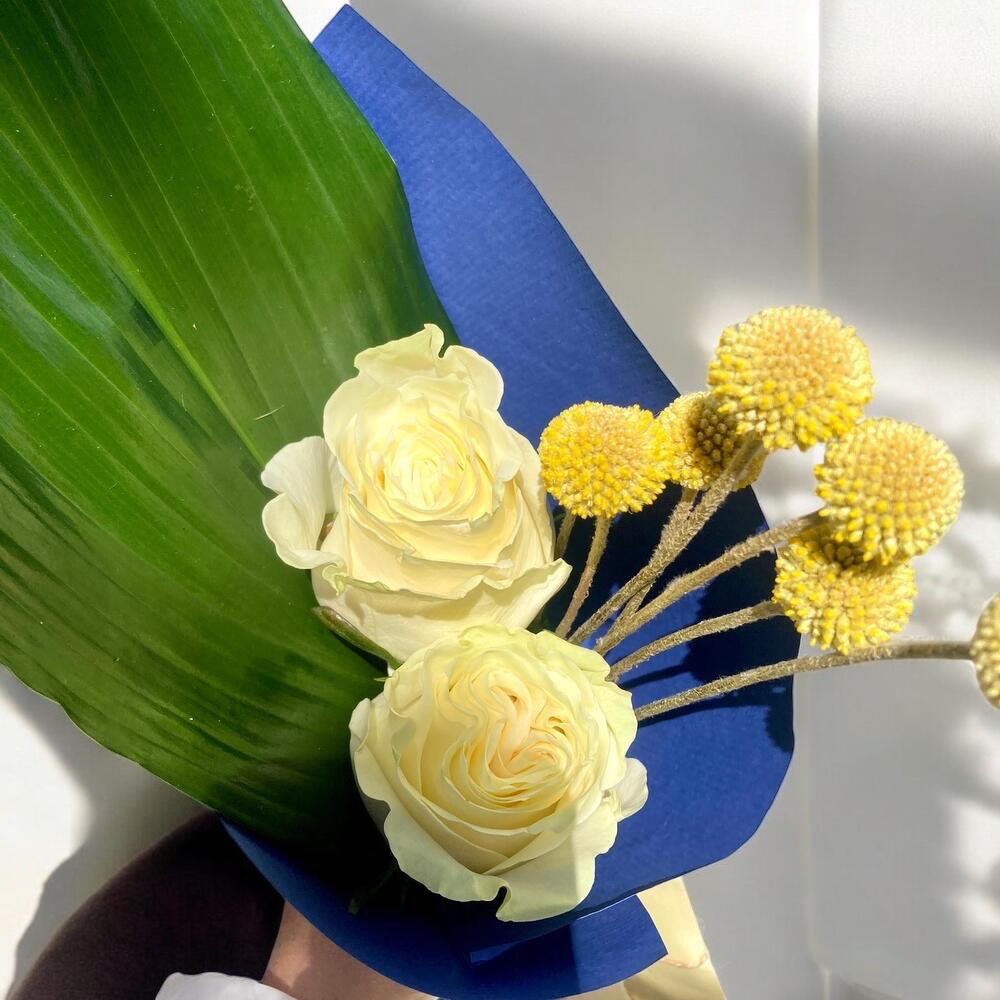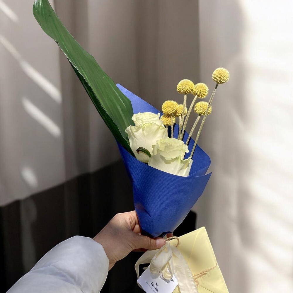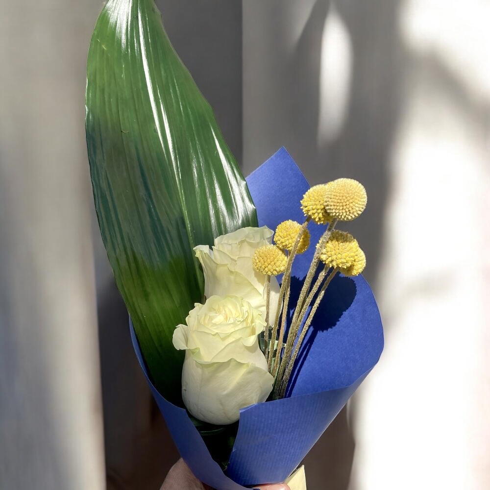rosas blancas - 2 ud. follaje - 1 ud. craspedias - 6 ud.