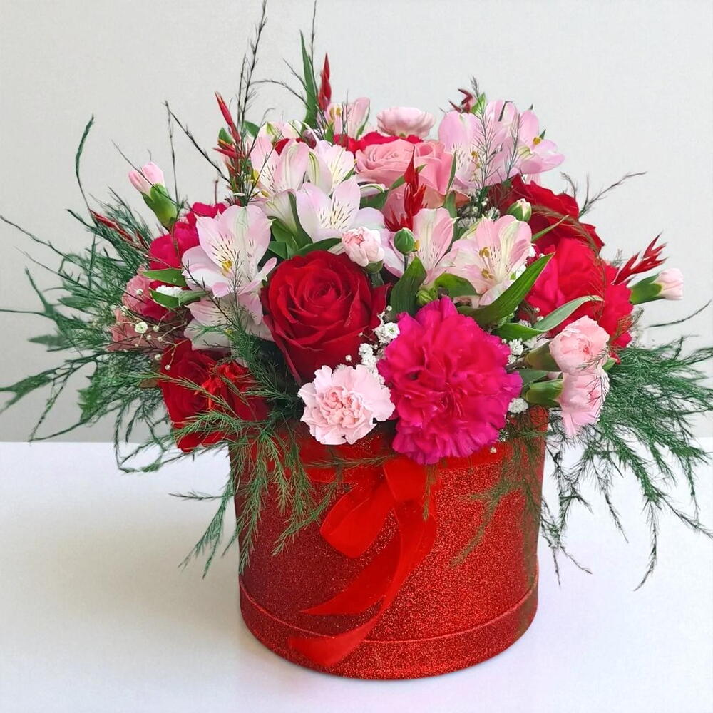 Este hermoso centro de flores es la elección perfecta para añadir un toque de sofisticación y elegancia a cualquier espacio. Compuesto por 4 clavellinas de intensos colores, 8 rosas frescas y fragantes, 4 vibrantes claveles, 6 astromerias llenas de vida y un triffer exquisito, este arreglo floral desprende una armonía inigualable. La composición viene en una elegante caja listo para ser disfrutado y destacado en cualquier lugar. Para que esto sea posible, también se incluye en el conjunto una espuma floral de primera calidad, que garantiza la frescura y durabilidad de las flores.