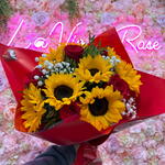 rosas rojas - 5 ud. girasole - 7 ud. papel decorativo - 1 ud. verdes frescos - 1 ud.