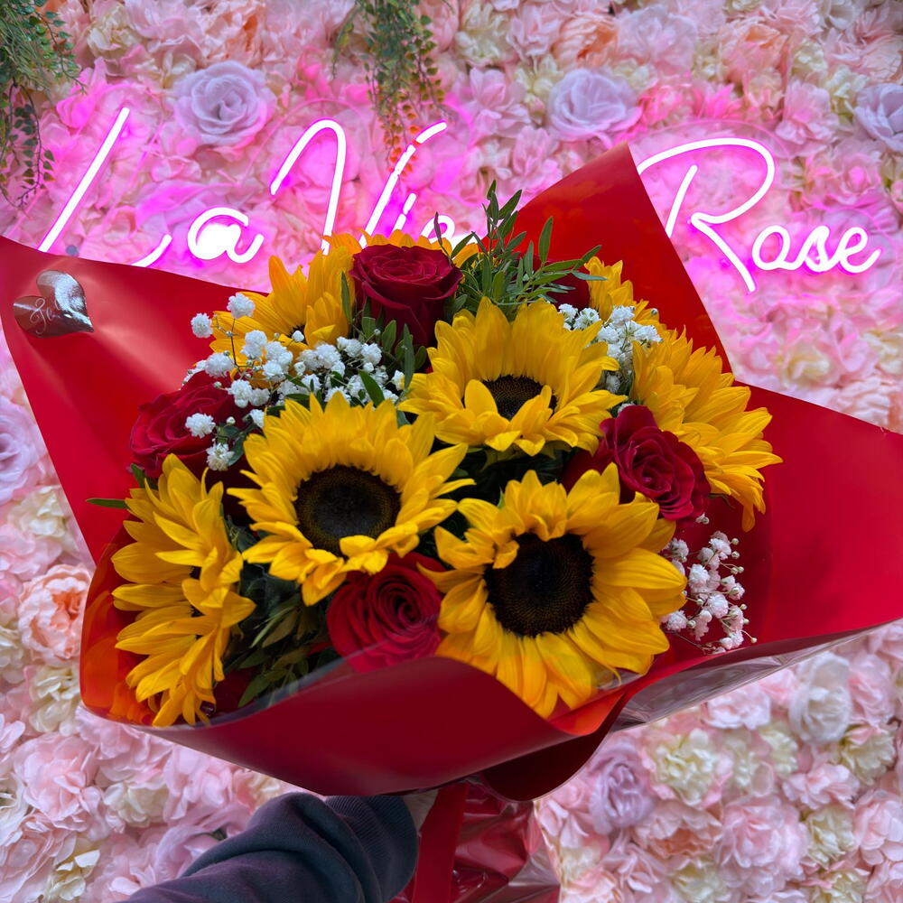 rosas rojas - 5 ud. girasole - 7 ud. papel decorativo - 1 ud. verdes frescos - 1 ud.
